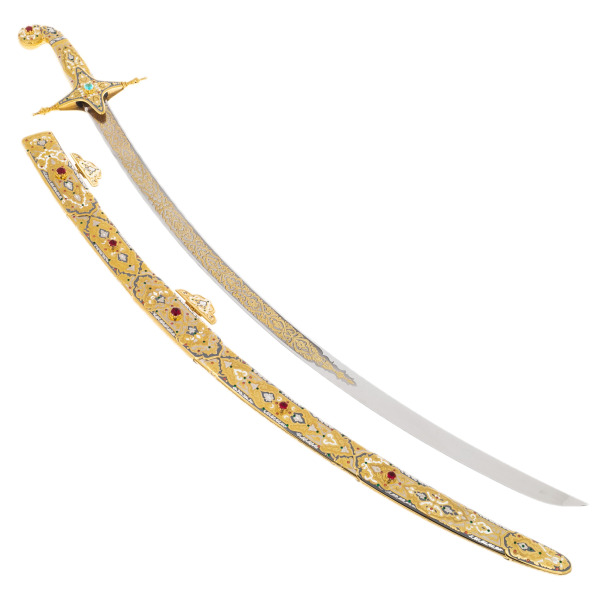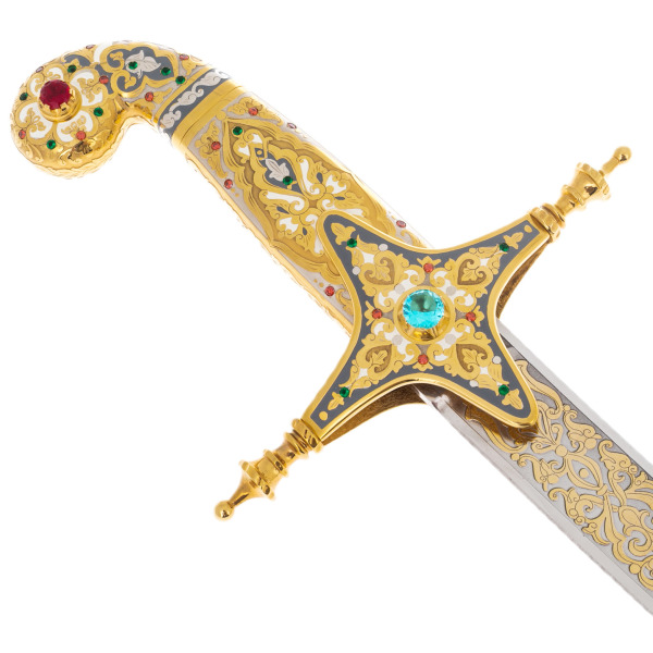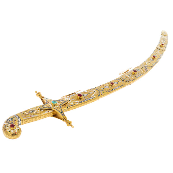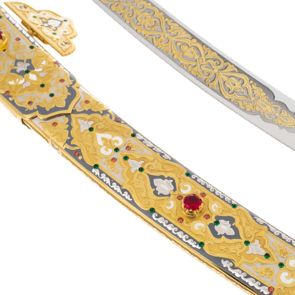 Лезвие сабли отражает классический восточный стиль с легким изгибом, типичным для сабель этой категории. Рукоять и ножны сабли оформлены золотом и вставками из фианитами, придающими изделию блеск и статус. Эти драгоценные камни дополнительно подчеркивают изысканность и роскошь сабли, делая её истинным произведением ювелирного искусства.