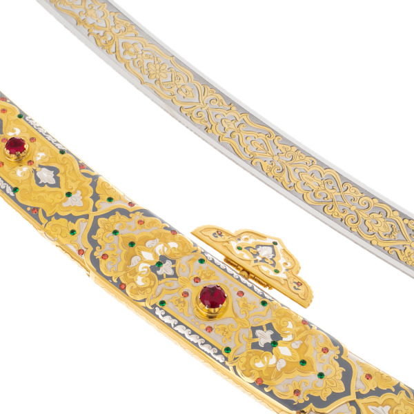 Техника златоустовской гравировки, использованная при изготовлении клинка, требует исключительного мастерства и ювелирной точности. Все элементы вручную нанесены на металл с применением золочения, чернения и серебрения. На клинке — сложный восточный узор, будто вытканный из золота и света, который подчёркивает статус владельца. Полировка, контраст материалов и игра отражений создают ощущение живой поверхности, переливающейся при каждом движении. Это не просто холодное оружие, а олицетворение традиций и роскоши.