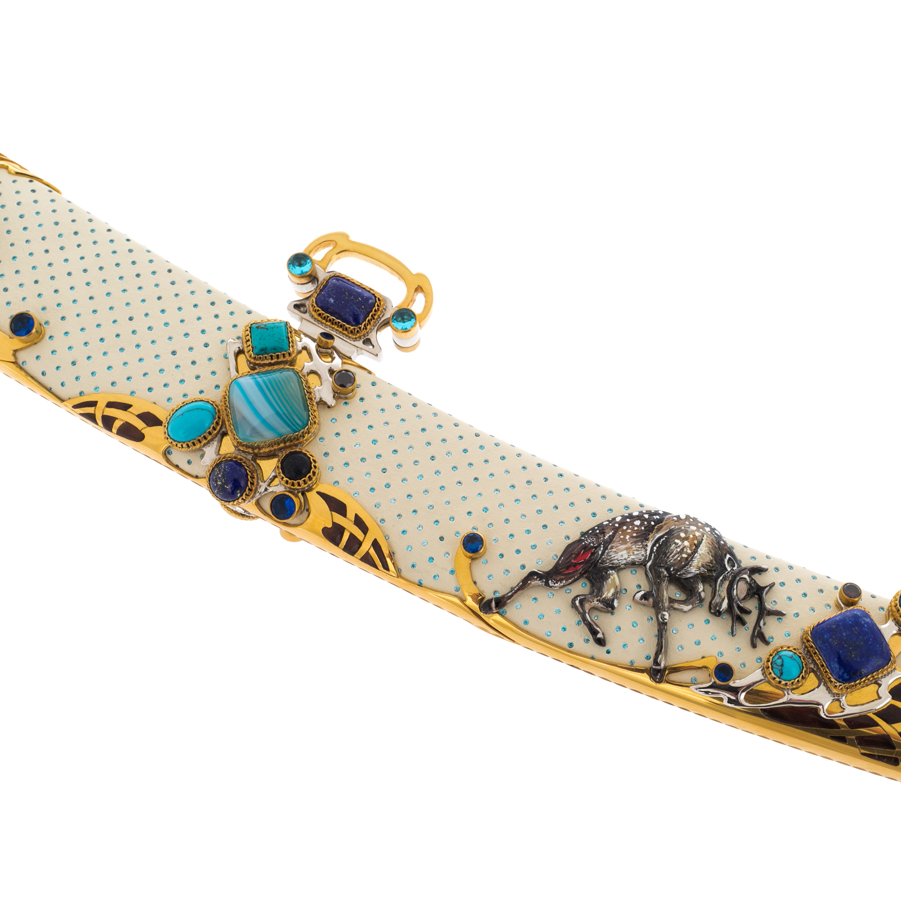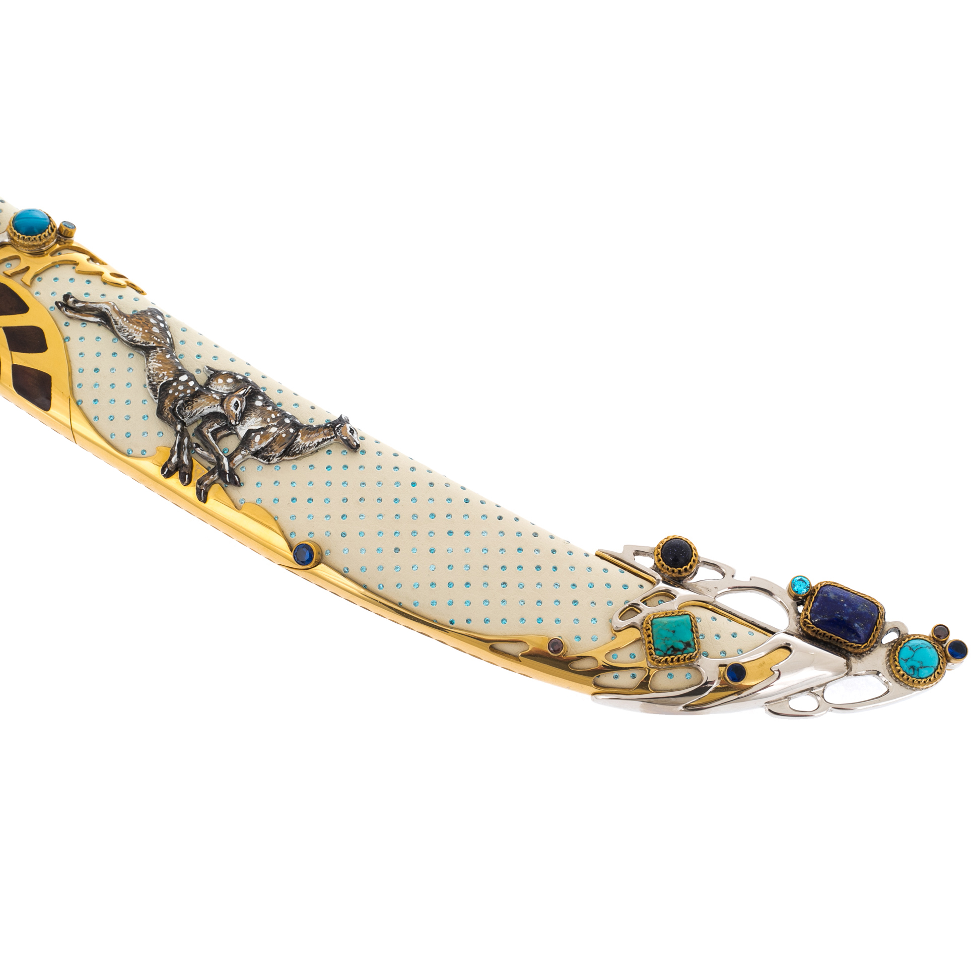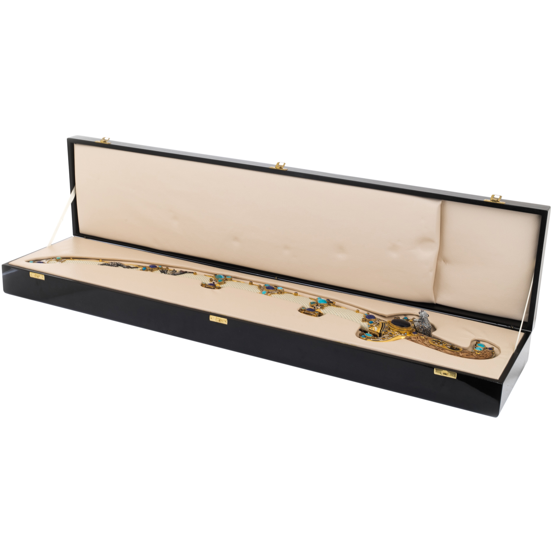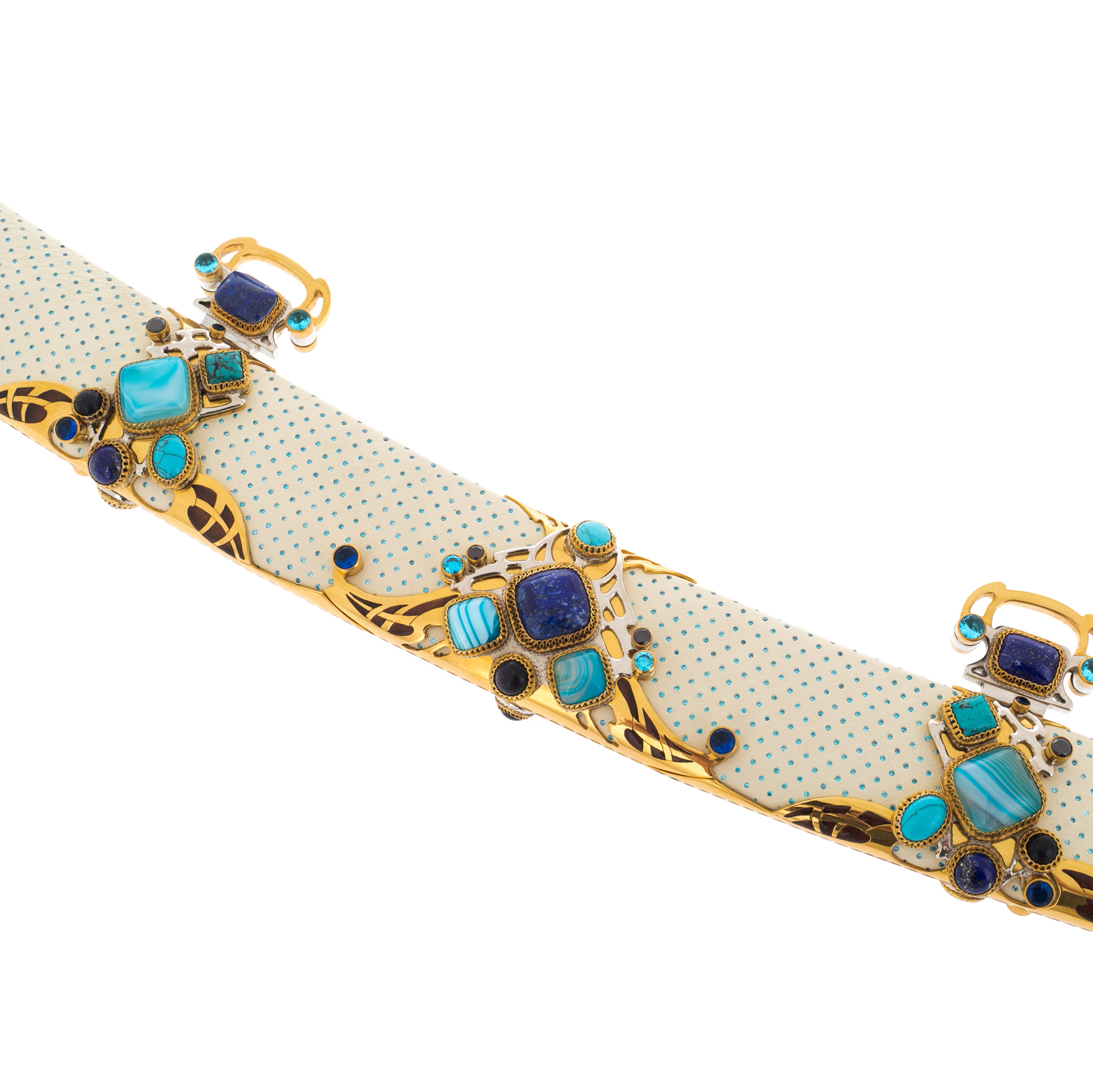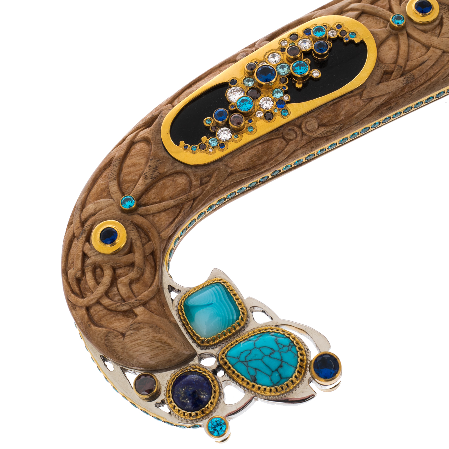 Содержание драгоценных металлов: никель — 25 мкм, золото — 15 мкм, бирюза — 74 шт., бесцветные топазы — 3263 шт.