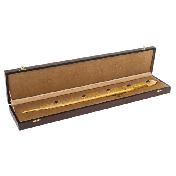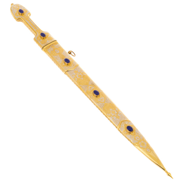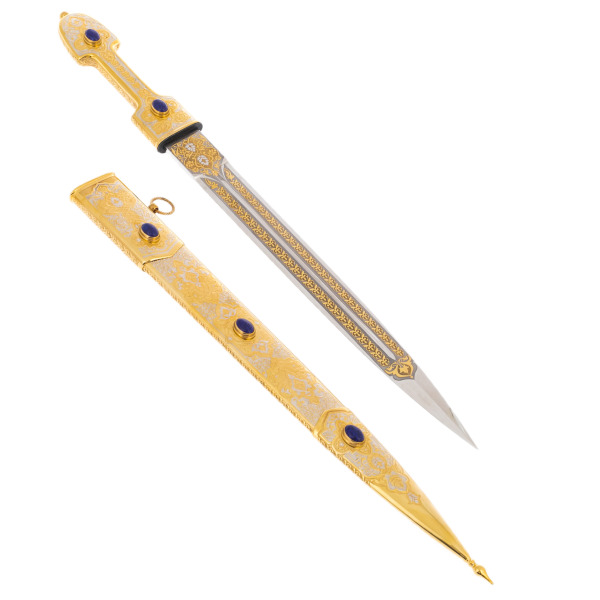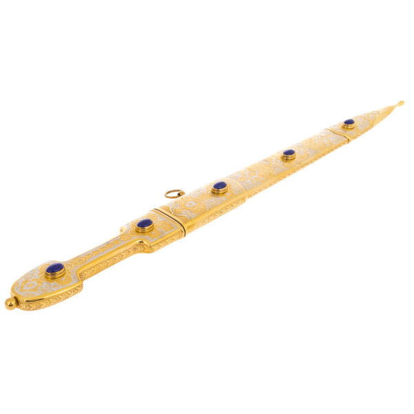 Ножны, украшенные изящной чеканкой и украшенные теми же камнями, играют роль достойного обрамления для этой реликвии. Лазуритовые вставки притягивают взгляд, добавляя произведению уверенности и царственности. Внутри элегантного футляра кинжал словно покоится на троне, подчёркивая своё место в коллекции ценителей настоящего совершенства.
