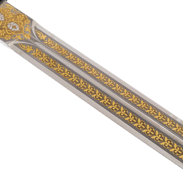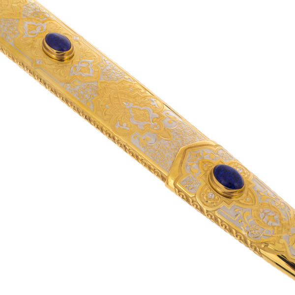 Ножны, выполненные в золотом сиянии, украшают этот шедевр не менее эффектно. Гравировка с орнаментом подчеркивает роскошь изделия, а золотые и черненые вставки гармонично дополняют общую композицию, создавая ощущение цельности и завершенности.