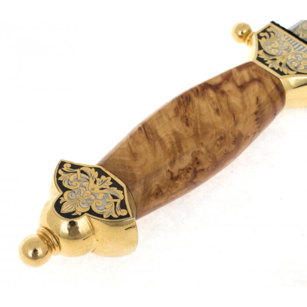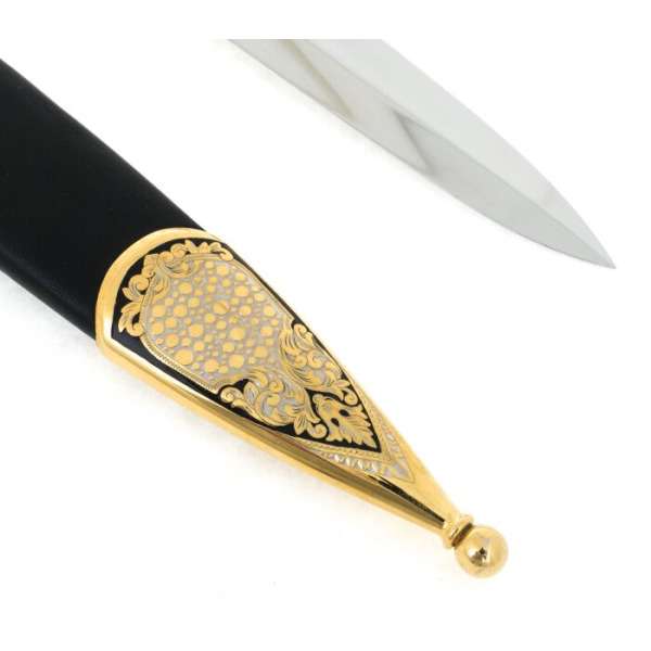 Ножны, выполненные в золотом сиянии, украшают этот шедевр не менее эффектно. Гравировка с орнаментом подчеркивает роскошь изделия, а золотые и черненые вставки гармонично дополняют общую композицию, создавая ощущение цельности и завершенности.