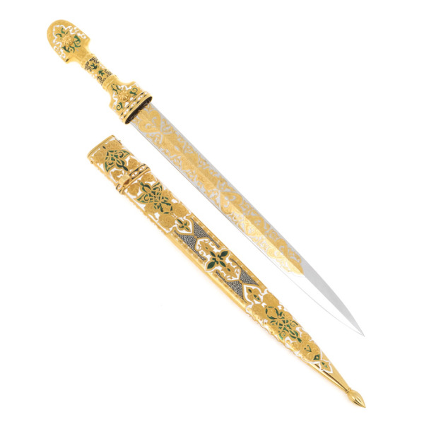 Ножны, выполненные в золотом сиянии, украшают этот шедевр не менее эффектно. Гравировка с орнаментом подчеркивает роскошь изделия, а золотые и черненые вставки гармонично дополняют общую композицию, создавая ощущение цельности и завершенности.
