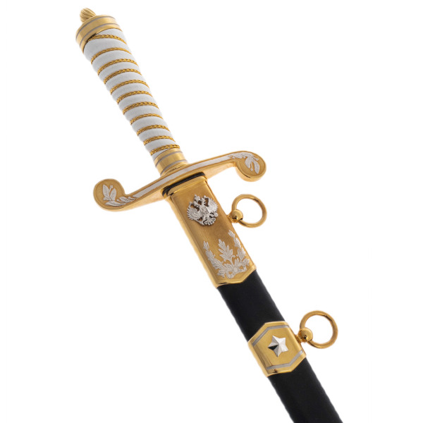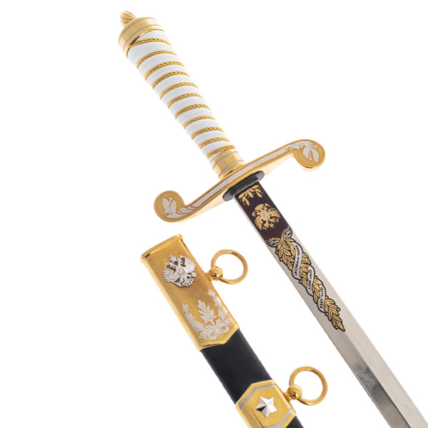 Ножны окутаны черным цветом с позолоченными накладками, подчеркивающими статус владельца. Герб России, выполненный в технике гравировки, возвышается над поверхностью металла, утверждая непоколебимость традиций. Пятиконечная звезда завершает композицию, напоминая о вечном стремлении к вершинам.