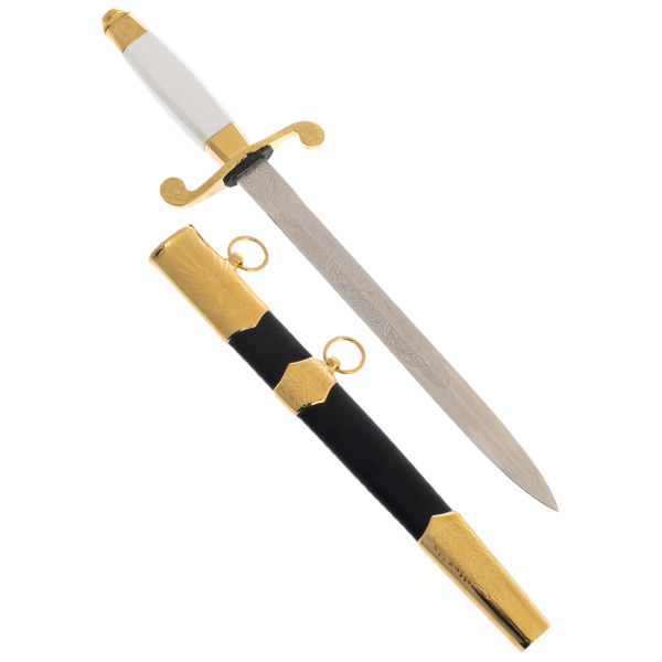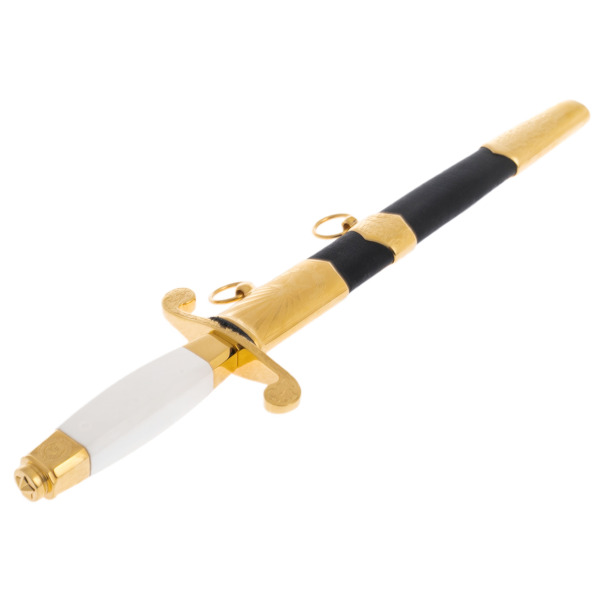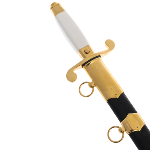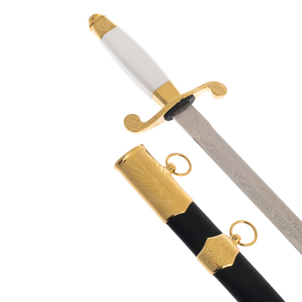 Ножны, облачённые в черное, дополнены золотыми накладками, чеканка которых напоминает лучи звезды, пронзающей тьму. Центральный мотив воплощает собой идею вечного сияния — символа тех, кто не просто следует пути, а прокладывает его. Позолоченные кольца позволяют подвесить кортик на мундир, завершая образ, исполненный достоинства и силы.