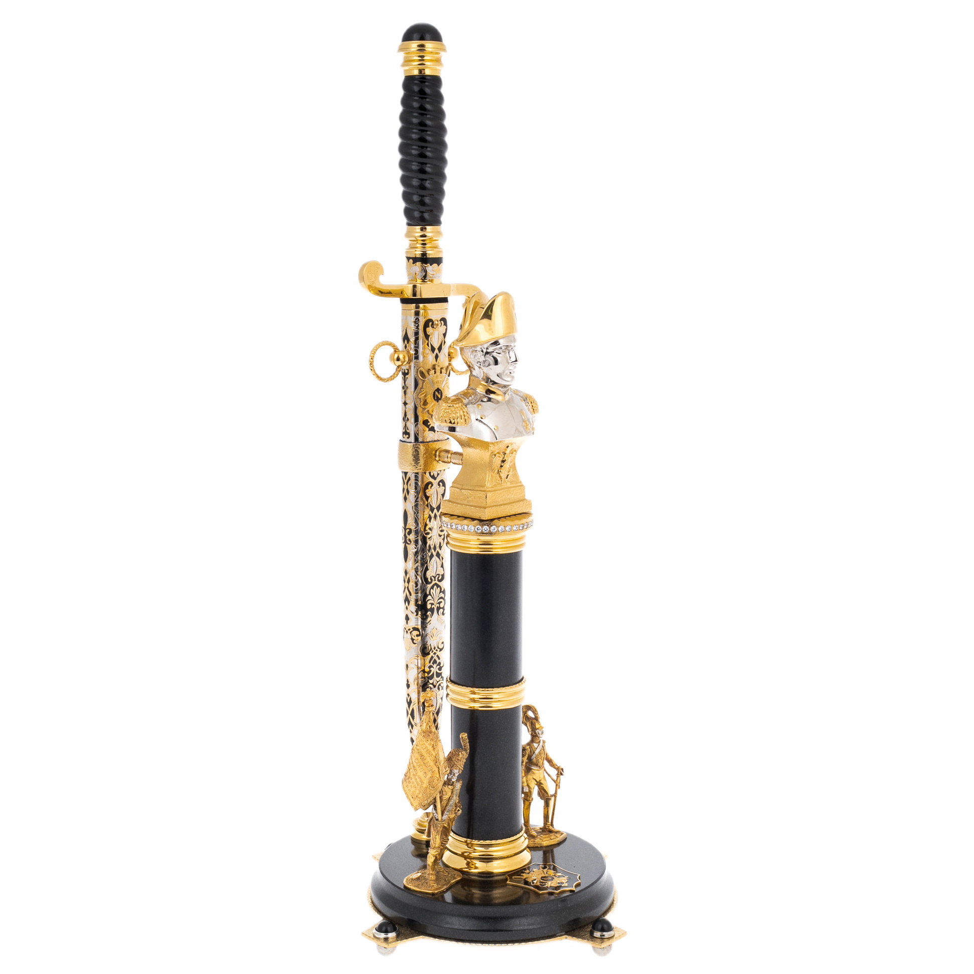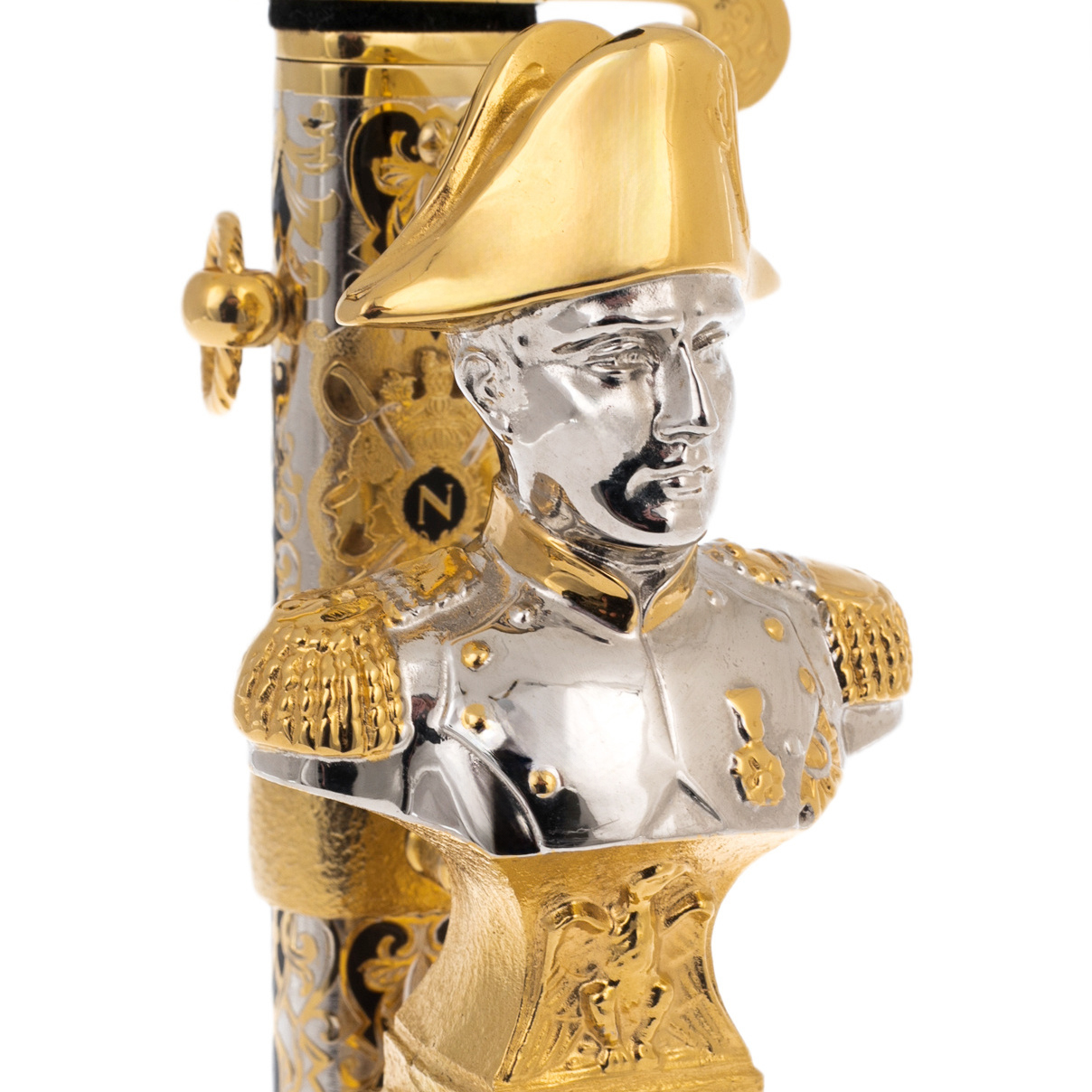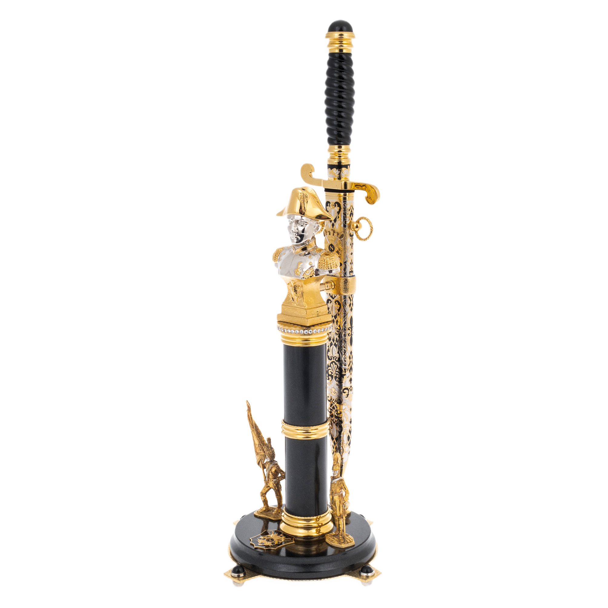 Авторская работа мастеров Златоуста, декоративный кортик «Наполеон» представляет собой воплощение торжественного величия и геральдической строгости. На подставке из чёрного дерева, украшенной миниатюрными фигурами гренадера и знаменосца, возвышается колонна с бюстом императора, выполненным из горного хрусталя и металла с позолотой. У основания композиции — чеканные элементы, отсылающие к воинской славе и традициям эпохи Наполеона. Композиция завершена лезвием кортика, вмонтированным в вертикальный постамент — оружием, символизирующим честь, порядок и беспрекословную волю лидера.