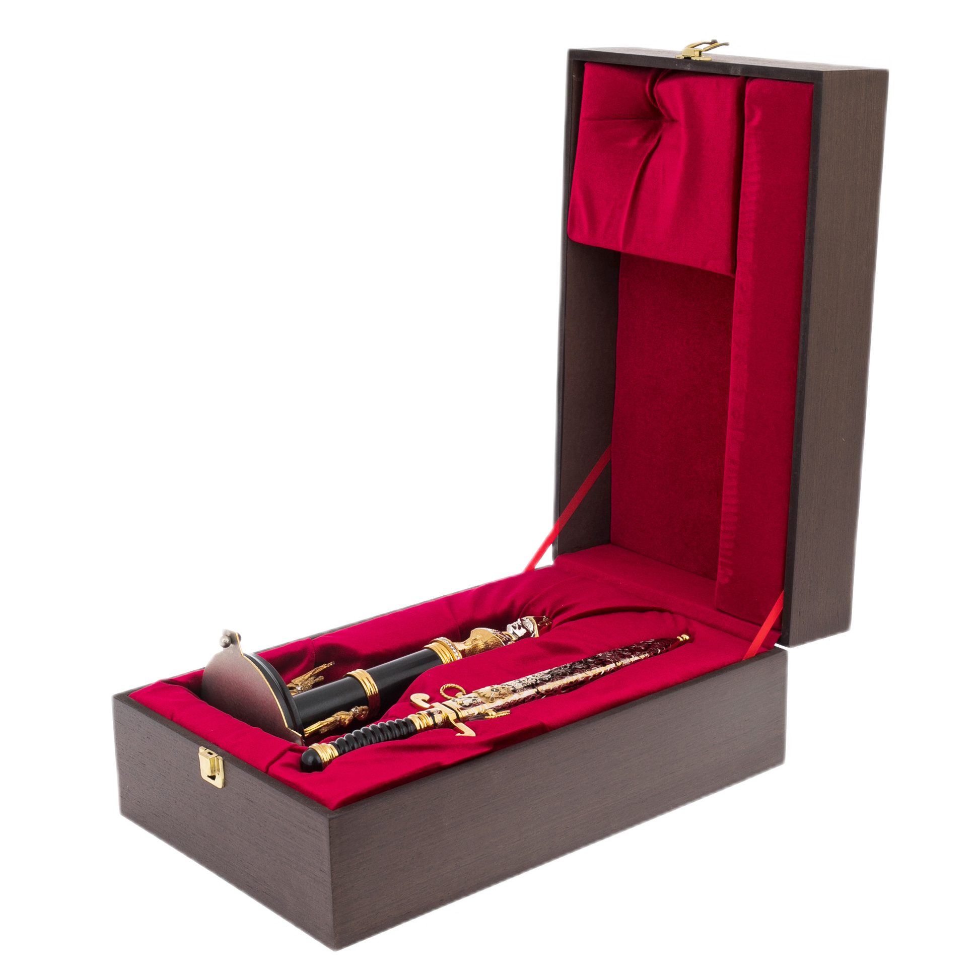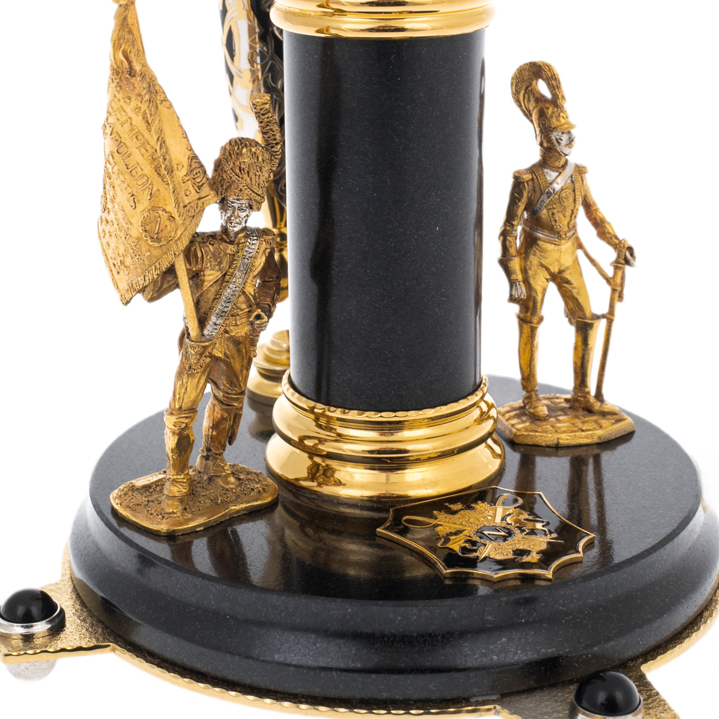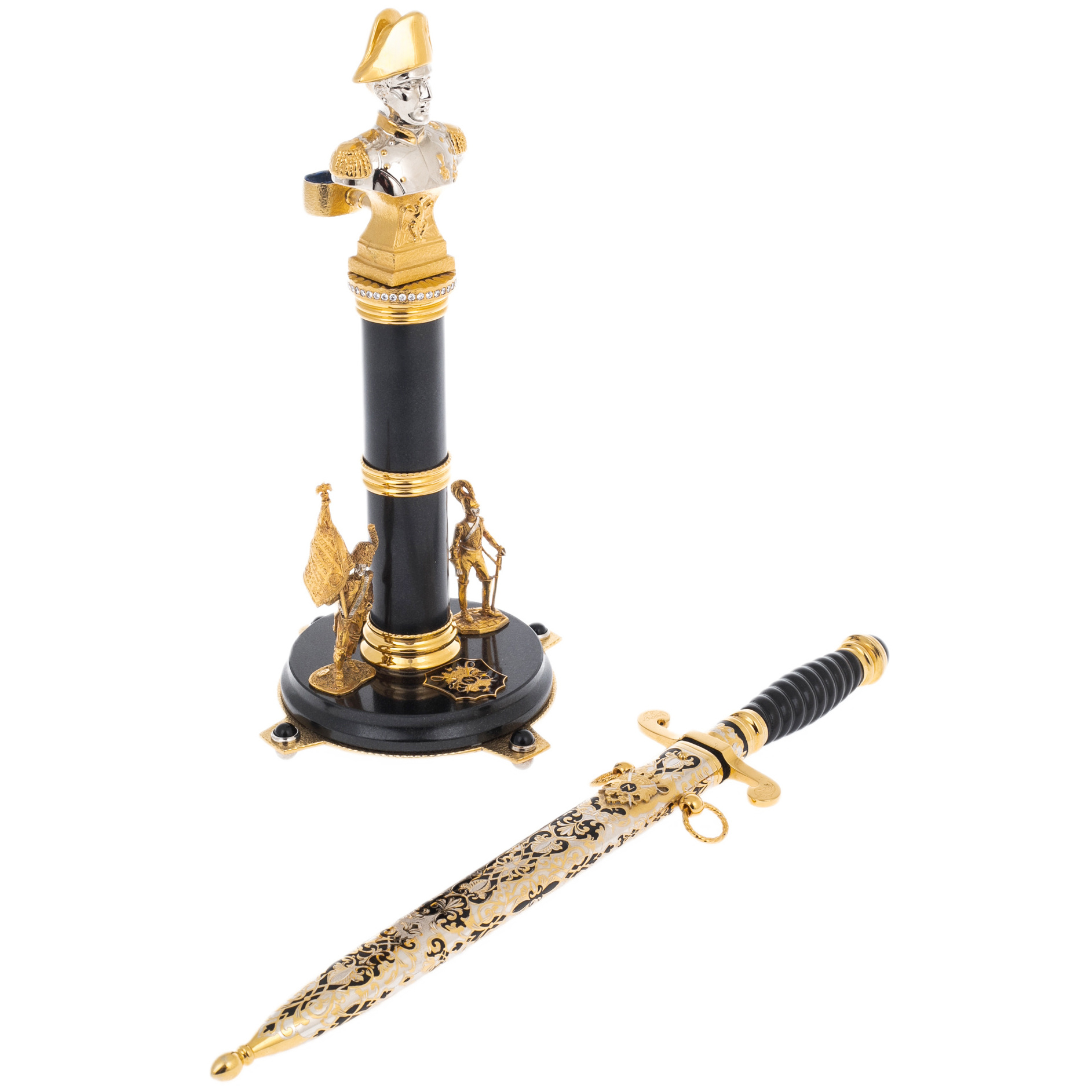Авторская работа мастеров Златоуста, декоративный кортик «Наполеон» представляет собой воплощение торжественного величия и геральдической строгости. На подставке из чёрного дерева, украшенной миниатюрными фигурами гренадера и знаменосца, возвышается колонна с бюстом императора, выполненным из горного хрусталя и металла с позолотой. У основания композиции — чеканные элементы, отсылающие к воинской славе и традициям эпохи Наполеона. Композиция завершена лезвием кортика, вмонтированным в вертикальный постамент — оружием, символизирующим честь, порядок и беспрекословную волю лидера.