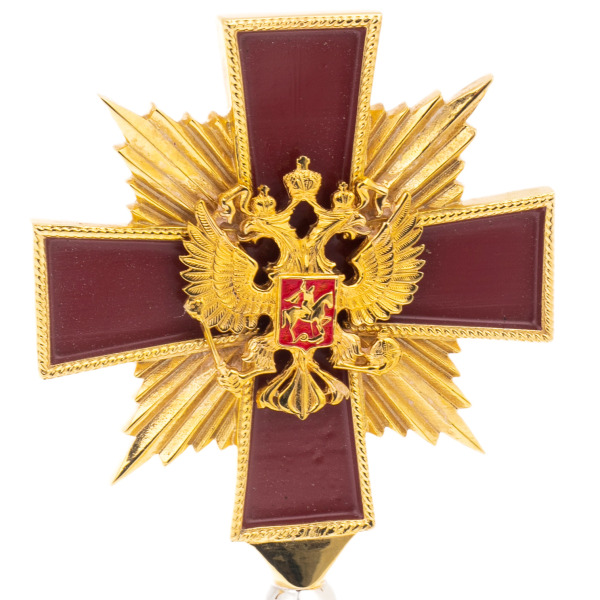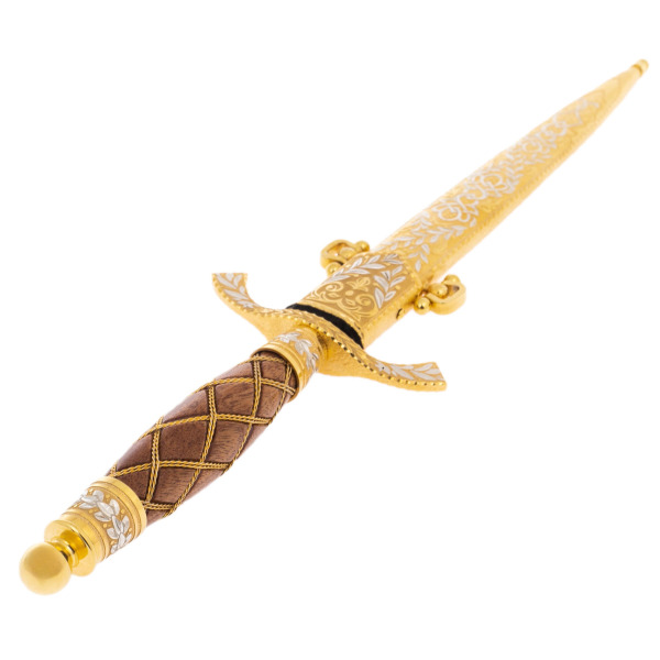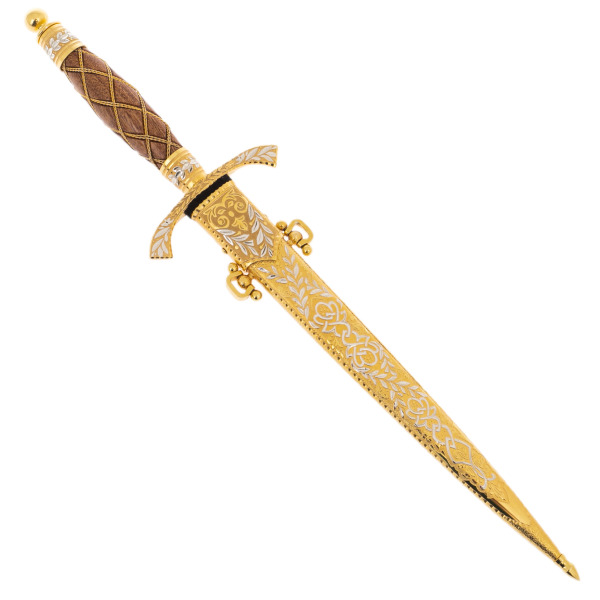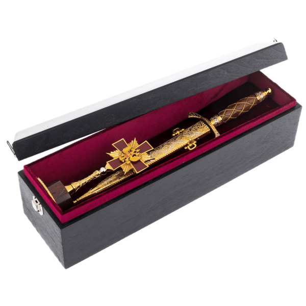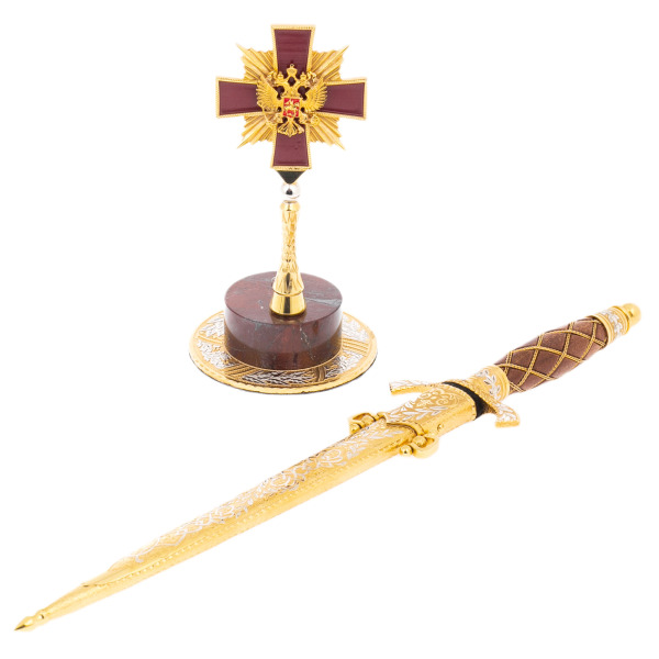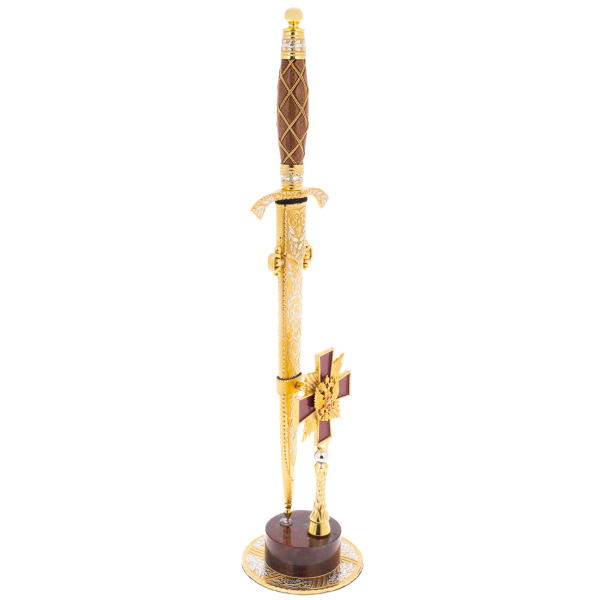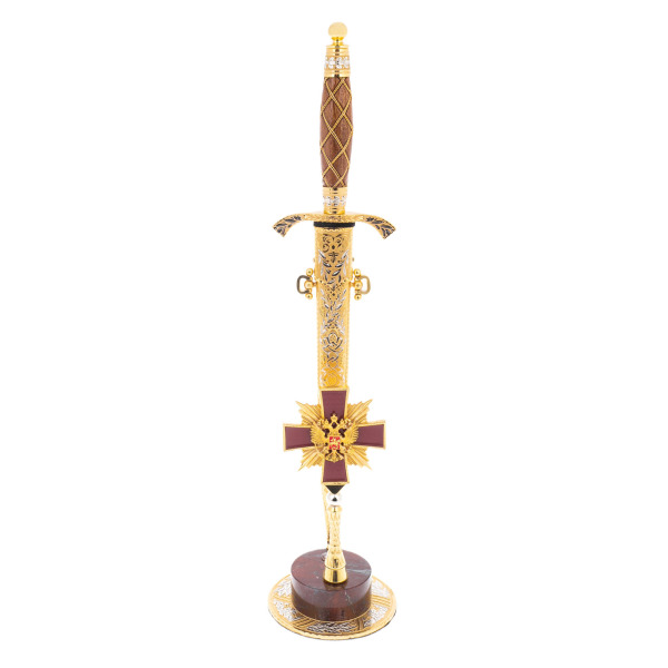 Кортик «Победа» из Златоуста — исключительный образец парадного холодного оружия, созданный как воплощение высших доблестей, памяти и силы. На мраморной подставке возвышается стальной клинок, заключённый в ножны, украшенные филигранным растительным орнаментом, нанесённым вручную в сложнейшей златоустовской технике. На пьедестале — массивный знак ордена с позолоченным двуглавым орлом, наложенным на багровую эмаль. Рельефные детали, сияющие на солнце, придают изделию внушительность, а глубокий алый цвет эмали перекликается с торжественностью боевых наград. Рукоять отделана натуральной кожей насыщенного коричневого оттенка и перевита золотым шнуром, создающим строгий геометричный рисунок.