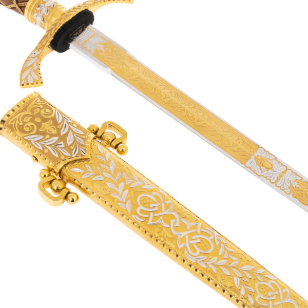 Мастера Златоуста уже несколько веков сохраняют и развивают уникальную технику гравировки и золочения по металлу. Каждый элемент этого кортика — результат сложного многоэтапного процесса: травление, вручную нанесённые узоры, чернение, шлифовка и золочение. На поверхности ножен и гарды можно разглядеть тончайшие прорисовки — орнаменты, вдохновлённые классическим оружейным декором имперской эпохи. Такой подход позволяет превратить функциональный предмет в арт-объект, имеющий музейную ценность. Высокая культура исполнения, чистота линий и совершенный баланс форм выделяют этот кортик среди прочих коллекционных экземпляров.