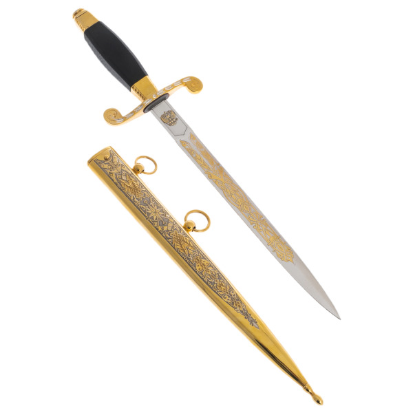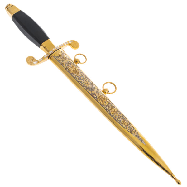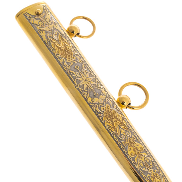 Ножны, облаченные в золото, окутаны узорами, в которых читаются истории великих мореплавателей, адмиралов и властителей морей. Каждая деталь доведена до совершенства: клейма, чеканка, орнаменты — все говорит о безупречном вкусе и уважении к высоким стандартам. Завершают композицию позолоченные кольца, отражающие неизменную связь времен, традиций и поколений.