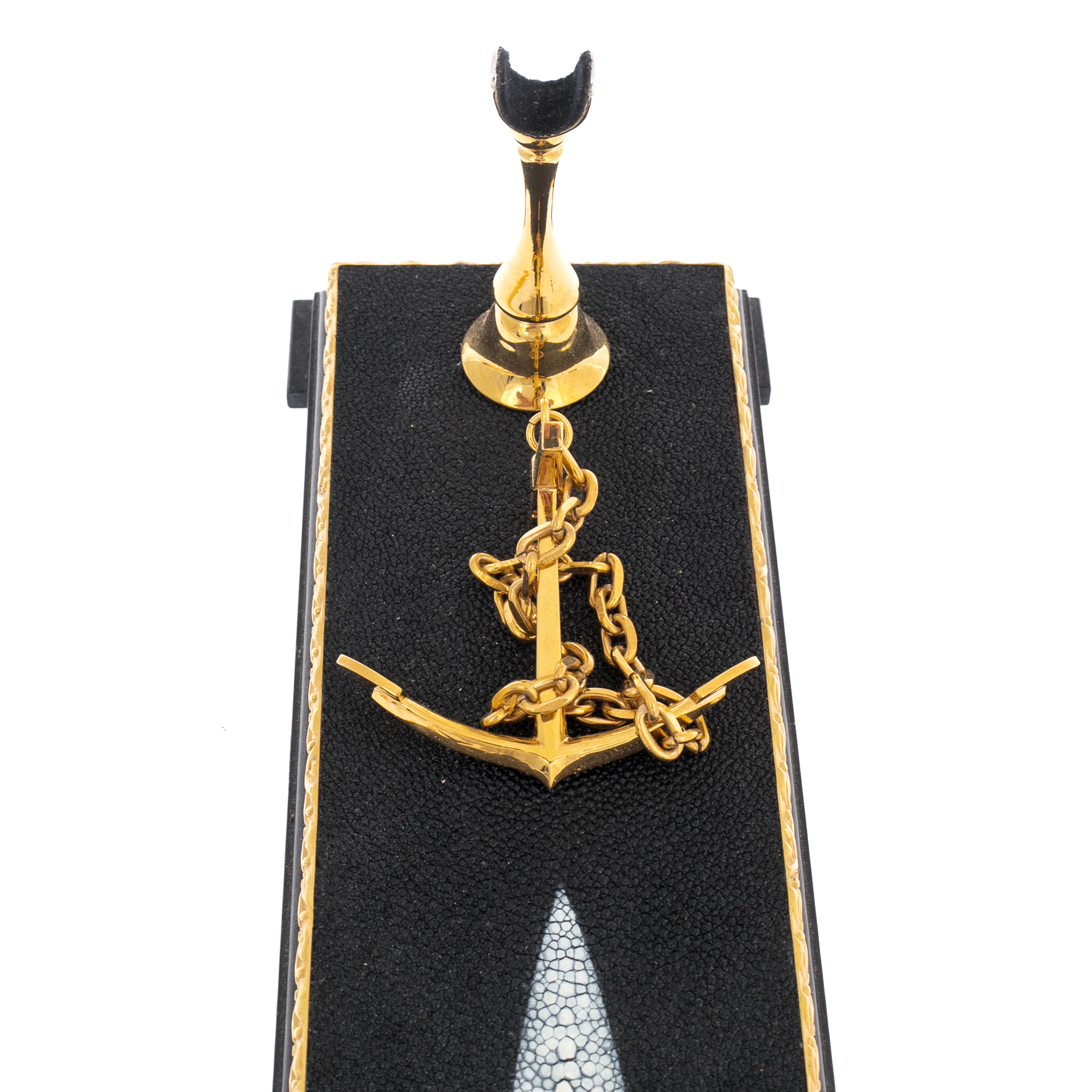 Черная лакированная подставка, инкрустированная вставкой из морского ската и обрамленная позолоченным бортиком, служит фоном для всей композиции. С одной стороны она поддерживает клинок, с другой — демонстрирует якорь на цепи, отлитый из металла и покрытый золотом, намекающий на преданность идее и стойкость перед бурями. Кортик на подставке — идеальный подарок для человека, прошедшего испытания и сумевшего сохранить внутреннюю цельность, для лидера, чей путь отмечен постоянством и элегантной силой.