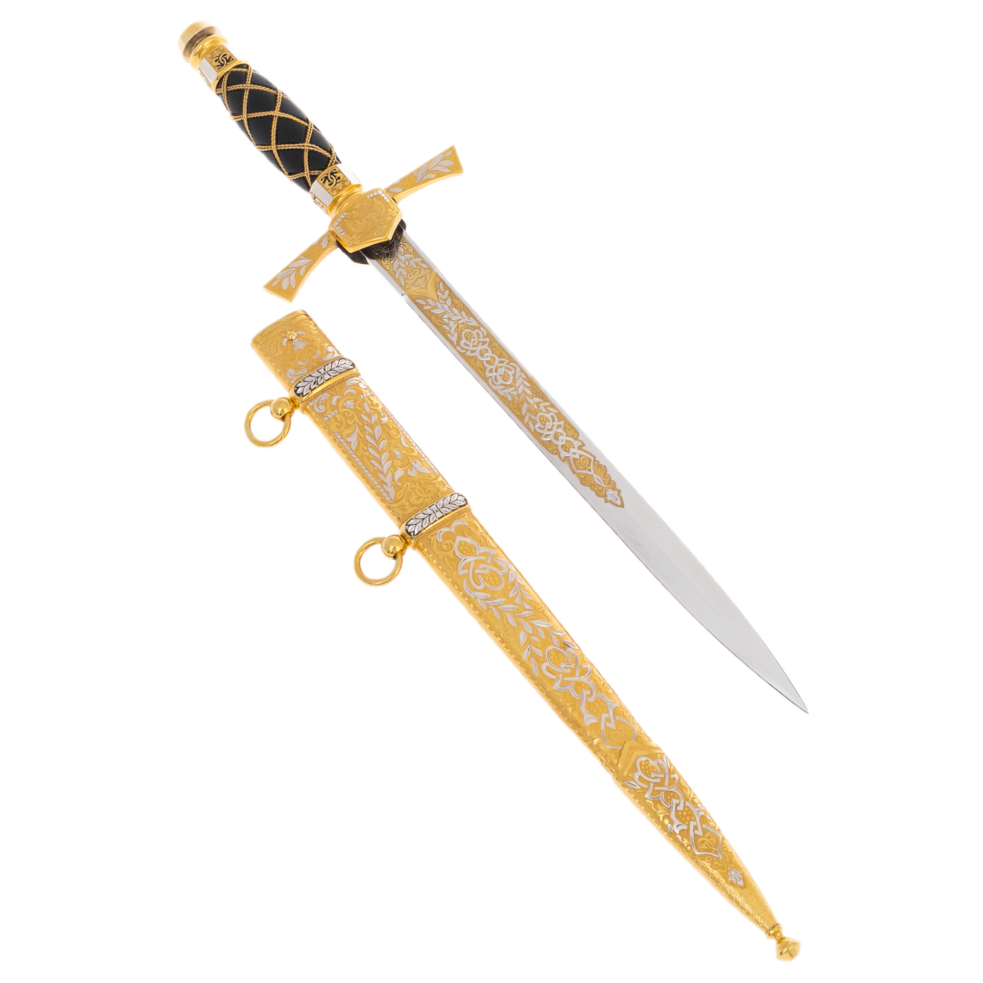 В оформлении клинка и ножен применена златоустовская техника, объединяющая травление, золочение и серебрение с гравировкой вручную. Каждая линия на стали, словно нанесённая кистью ювелира, сверкает чистотой исполнения, образуя сложный орнамент с растительными мотивами. Эмблема двуглавого орла с мечами на крестовине и лавровые ветви создают визуальный акцент, подчёркивающий символику силы, власти и воинской доблести. Роскошь отделки и безупречность пропорций делают этот предмет не просто сувениром, а эталоном мастерства и художественного вкуса.