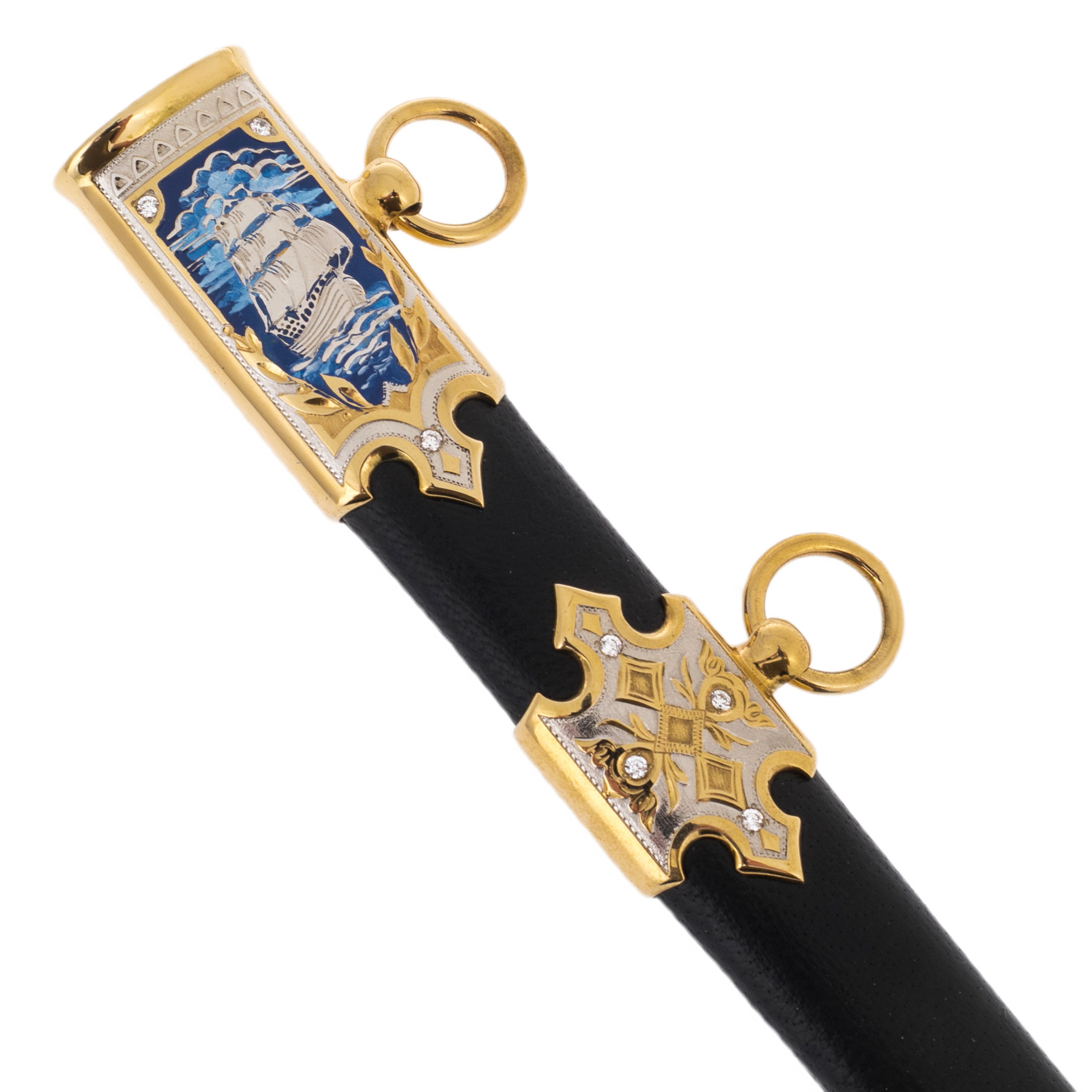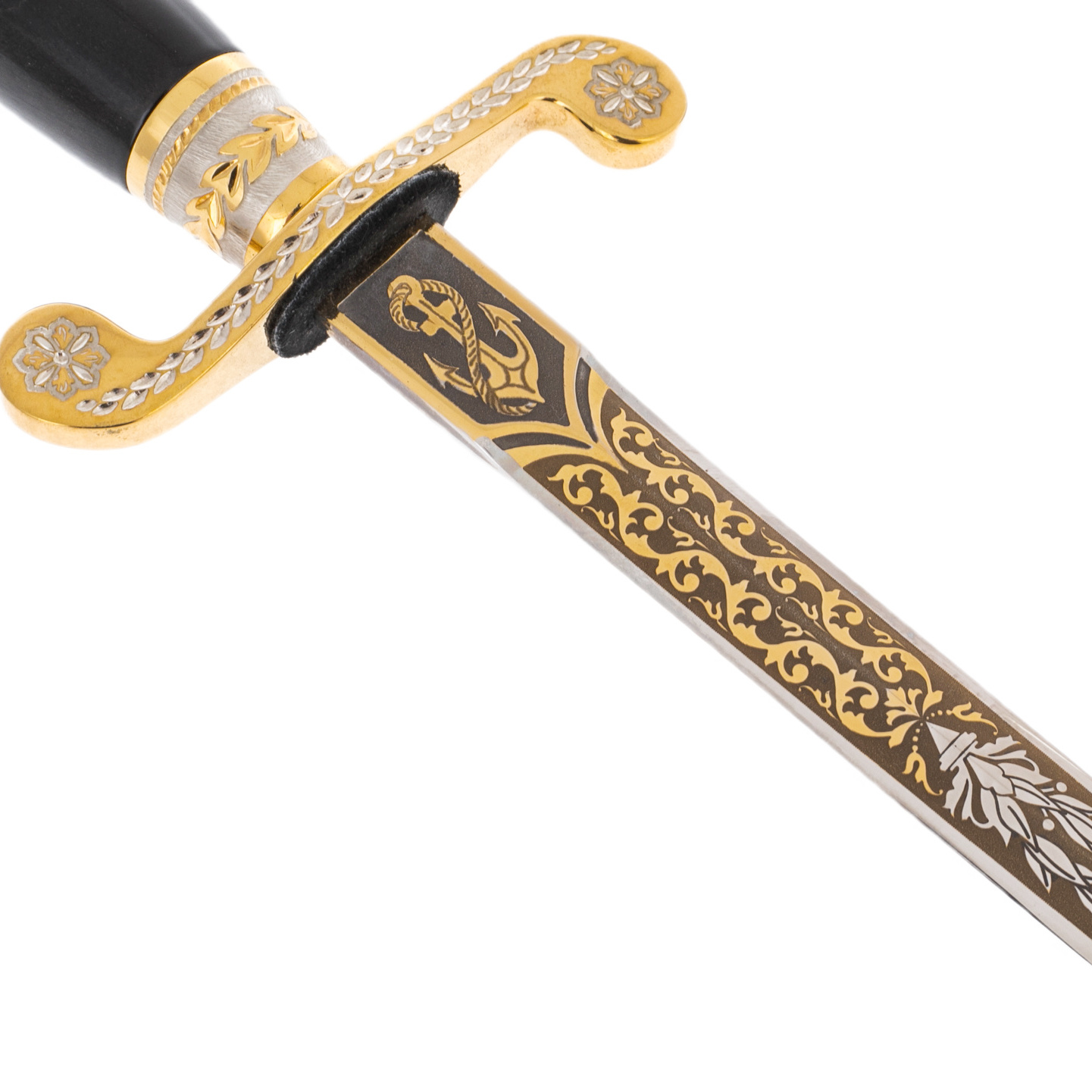 Стальное лезвие с гравировкой, украшенное золоченым растительным орнаментом, несет в себе не просто декоративную ценность, а является отражением той самой традиции, в которой оружие являлось символом офицерской доблести и высокого звания. Оно помещено в эффектные ножны, украшенные эмблемами военно-морского флота: якорь, воплощающий надежность и твердость характера, и стилизованный знак, намекающий на морское братство и верность принципам.