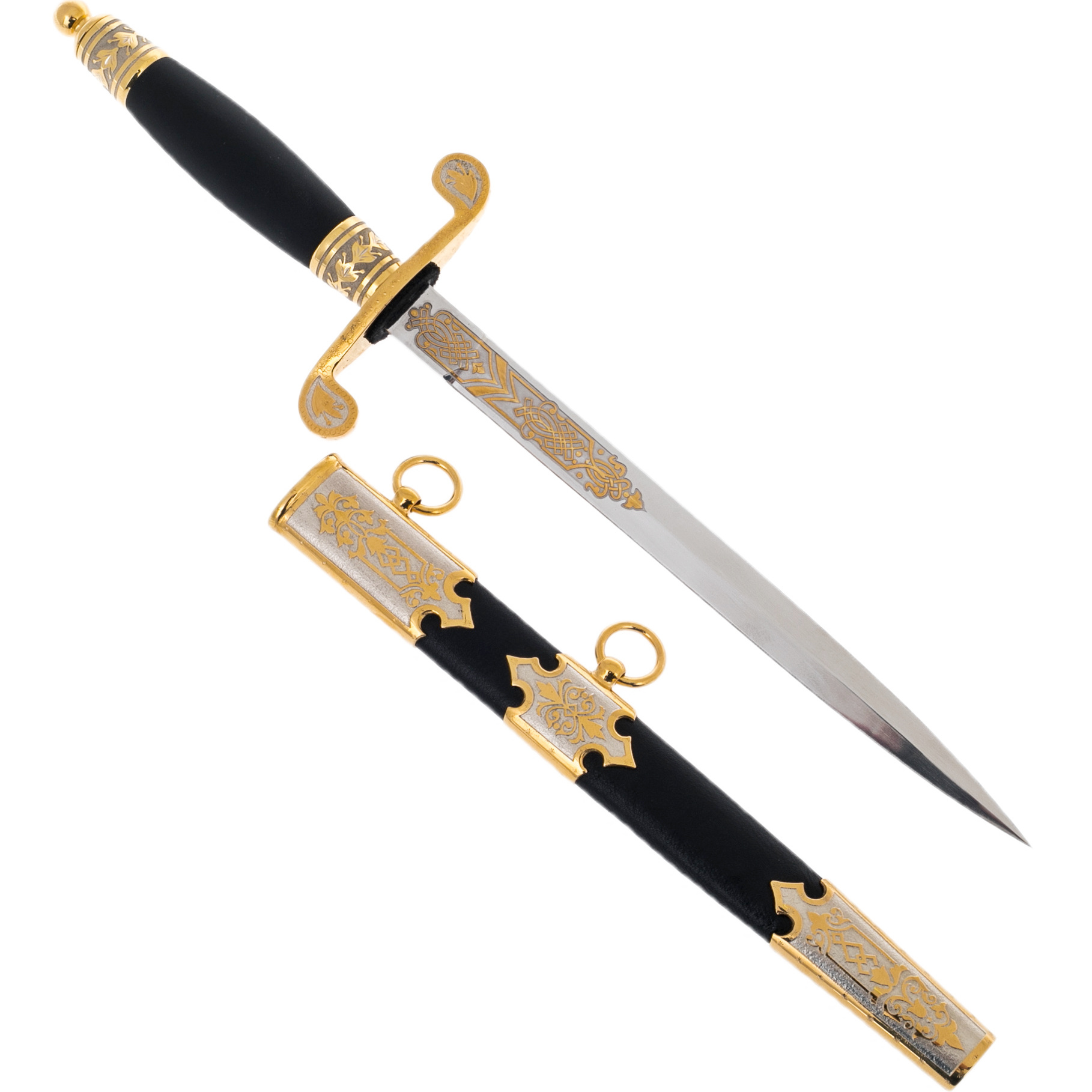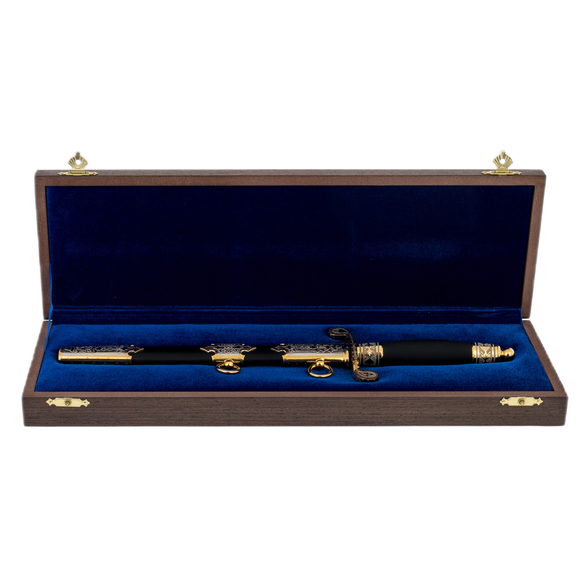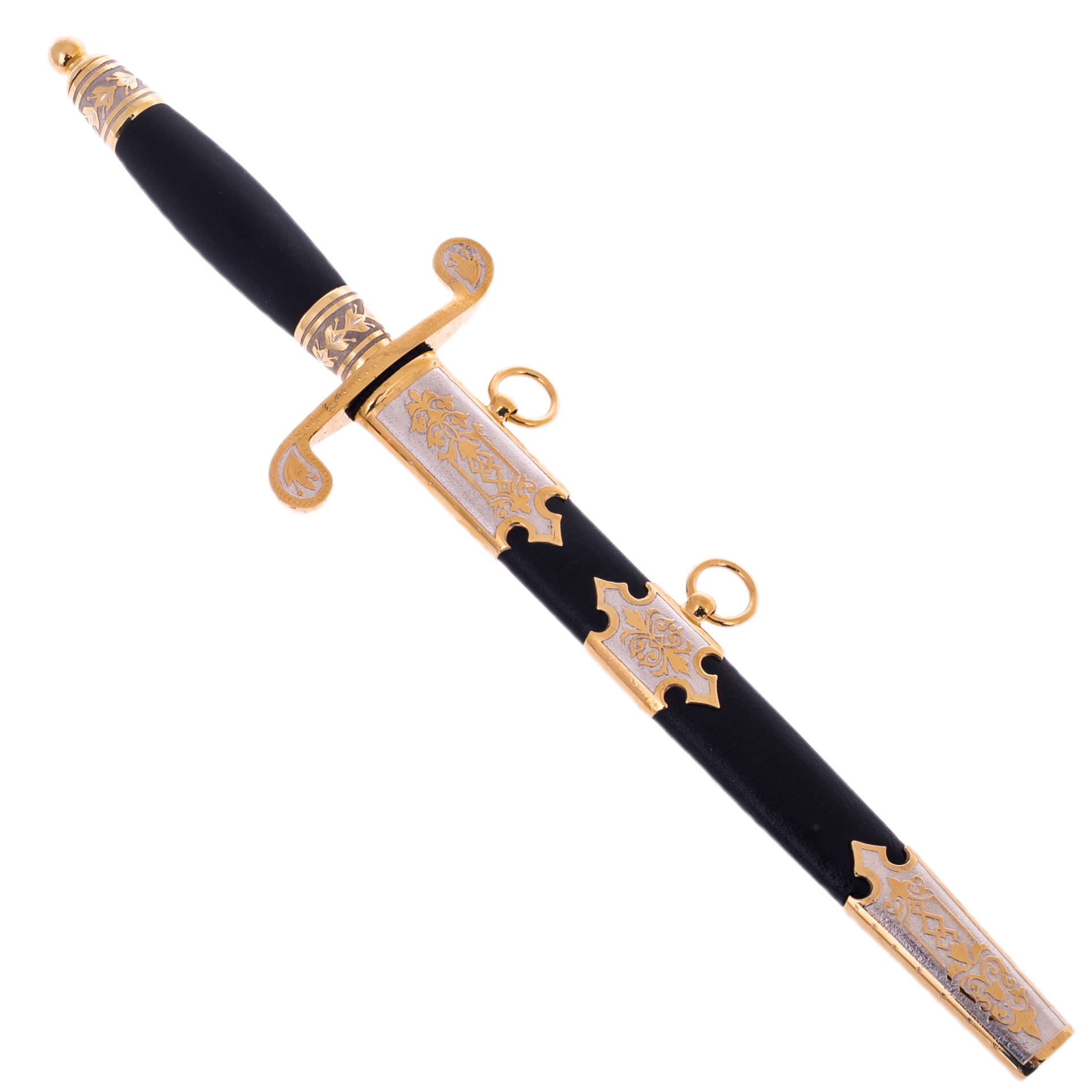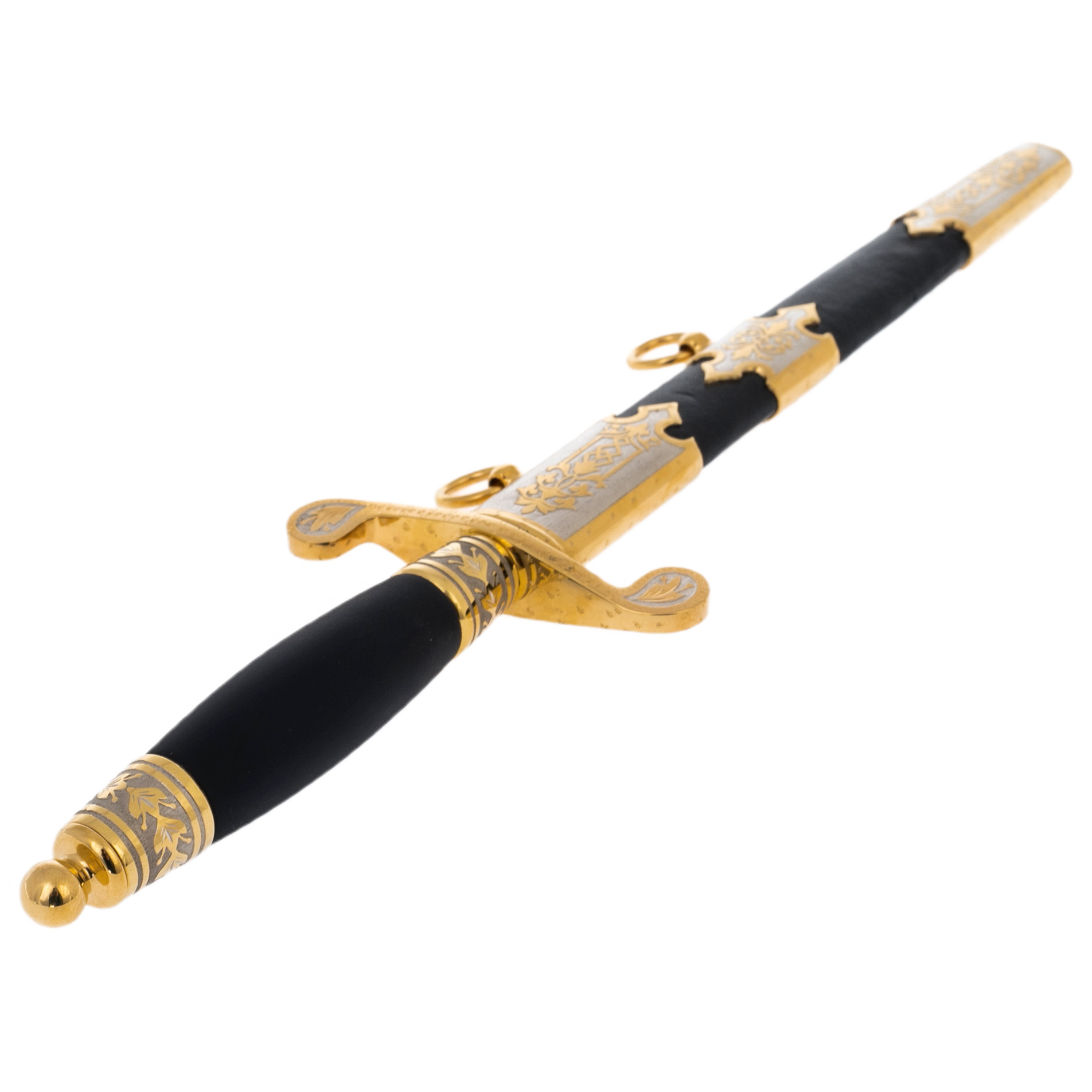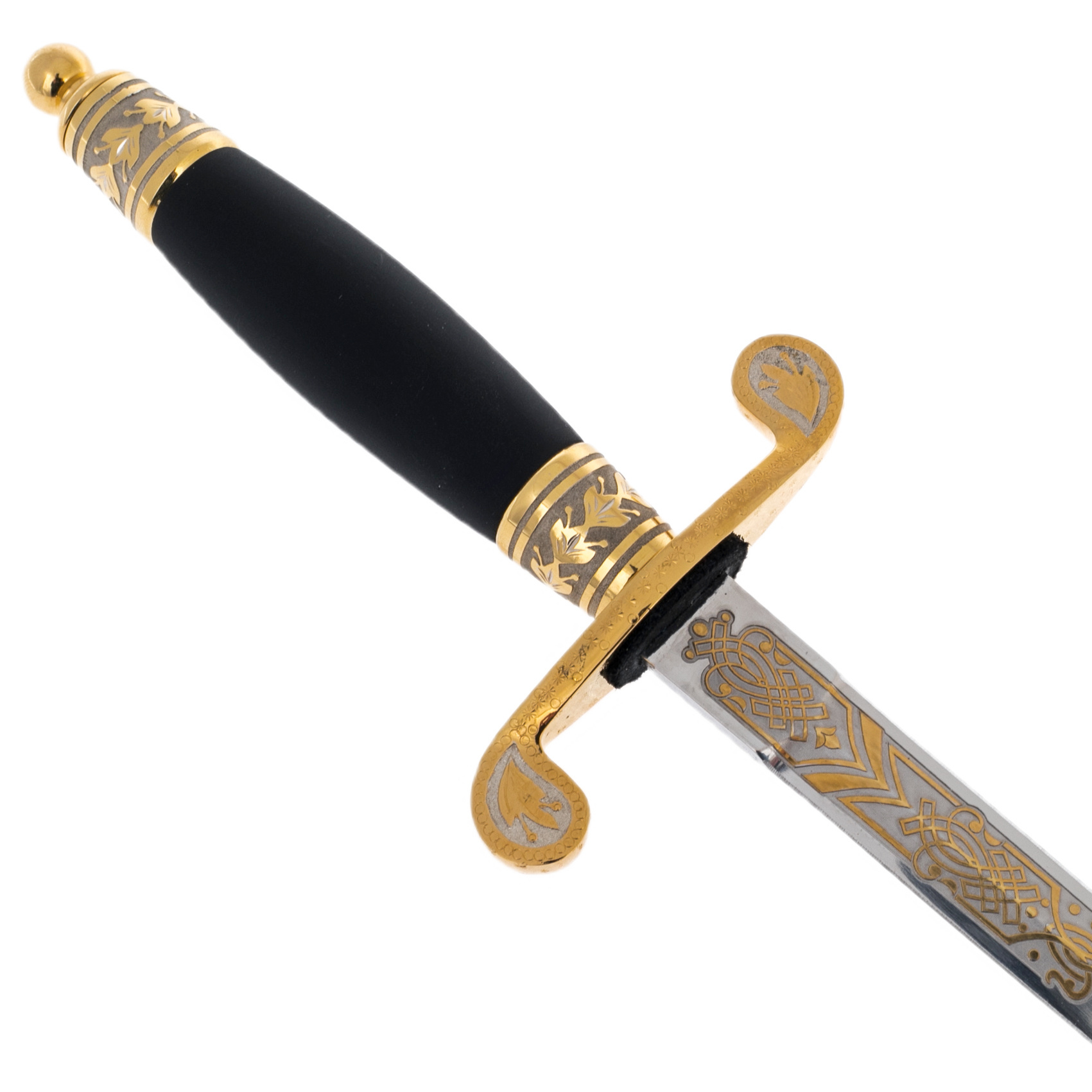 Гарда и навершие сияют золотом, их изящный орнамент с растительными мотивами придаёт оружию торжественность. Ножны, обтянутые чёрной кожей и украшенные золочёными накладками, завершают ансамбль — в них кортик выглядит не просто оружием, а символом чести и внутренней дисциплины.