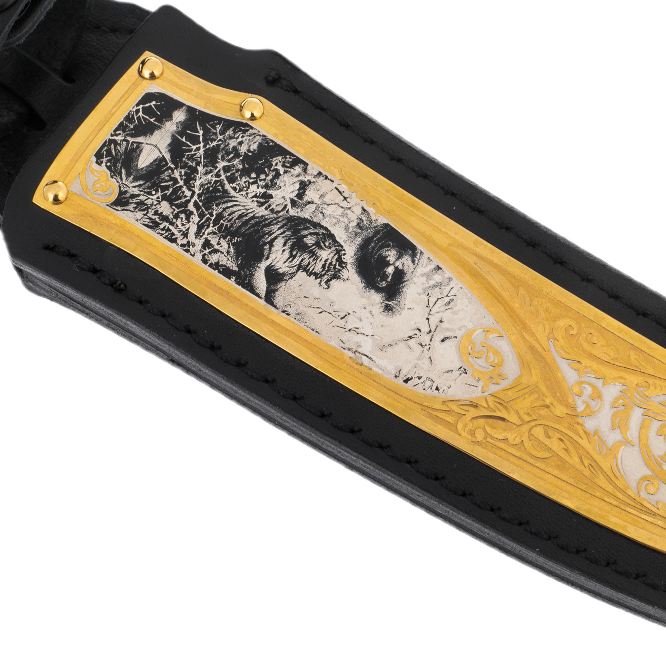 Ножны — продолжение истории. Их черная кожа обрамляет золотую пластину с изображением схватки тигра и медведя, извечного противостояния силы и мощи. Здесь нет победителя, только напряженность момента перед последним броском. Эта сцена говорит о высшей форме власти: умении выбирать битвы, в которых действительно важно одержать верх.
