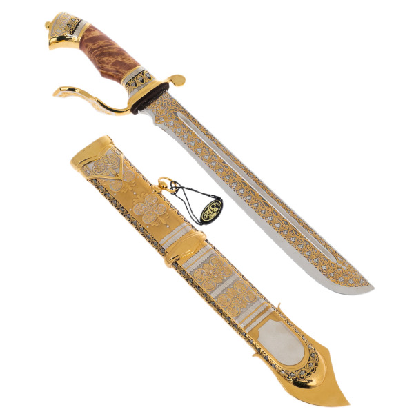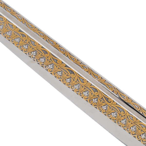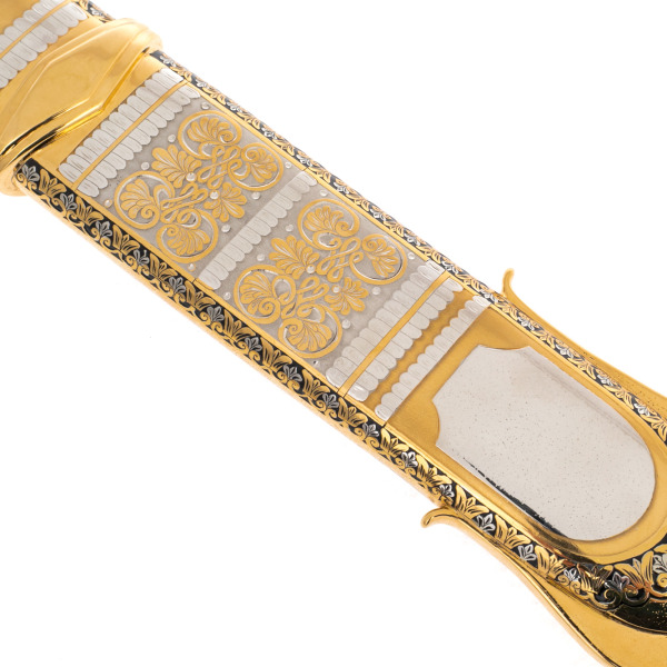Златоустовская техника украшения — старинное искусство, требующее филигранной точности и художественного чутья. Каждая линия на клинке, каждая завитушка на ножнах — результат ручной работы, в которой сочетаются гравировка, золочение и чернение. Особое внимание уделено ножнам: их оформление не уступает по роскоши самому оружию. Латунная оправа, многослойная инкрустация и зеркальная полировка придают композиции законченный облик предмета музейного уровня.