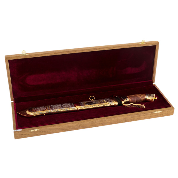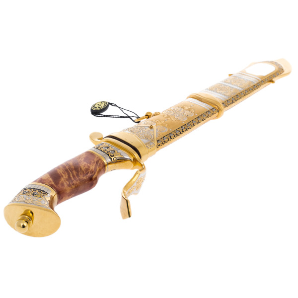 Сувенирный нож «Бизон», изготовленный в Златоусте, — это образец оружейной классики, в которой слились мощь, изящество и национальные традиции. Лезвие изготовлено из нержавеющей стали и украшено растительным орнаментом в золоте и чернении, тянущимся по всей длине в строгом, ритмичном рисунке. Рукоять выполнена из ценной карельской берёзы, отличающейся насыщенной текстурой и шелковистым блеском. Гарда и навершие отлиты из латуни, покрыты позолотой и украшены гравировкой, подчёркивающей статусность изделия.