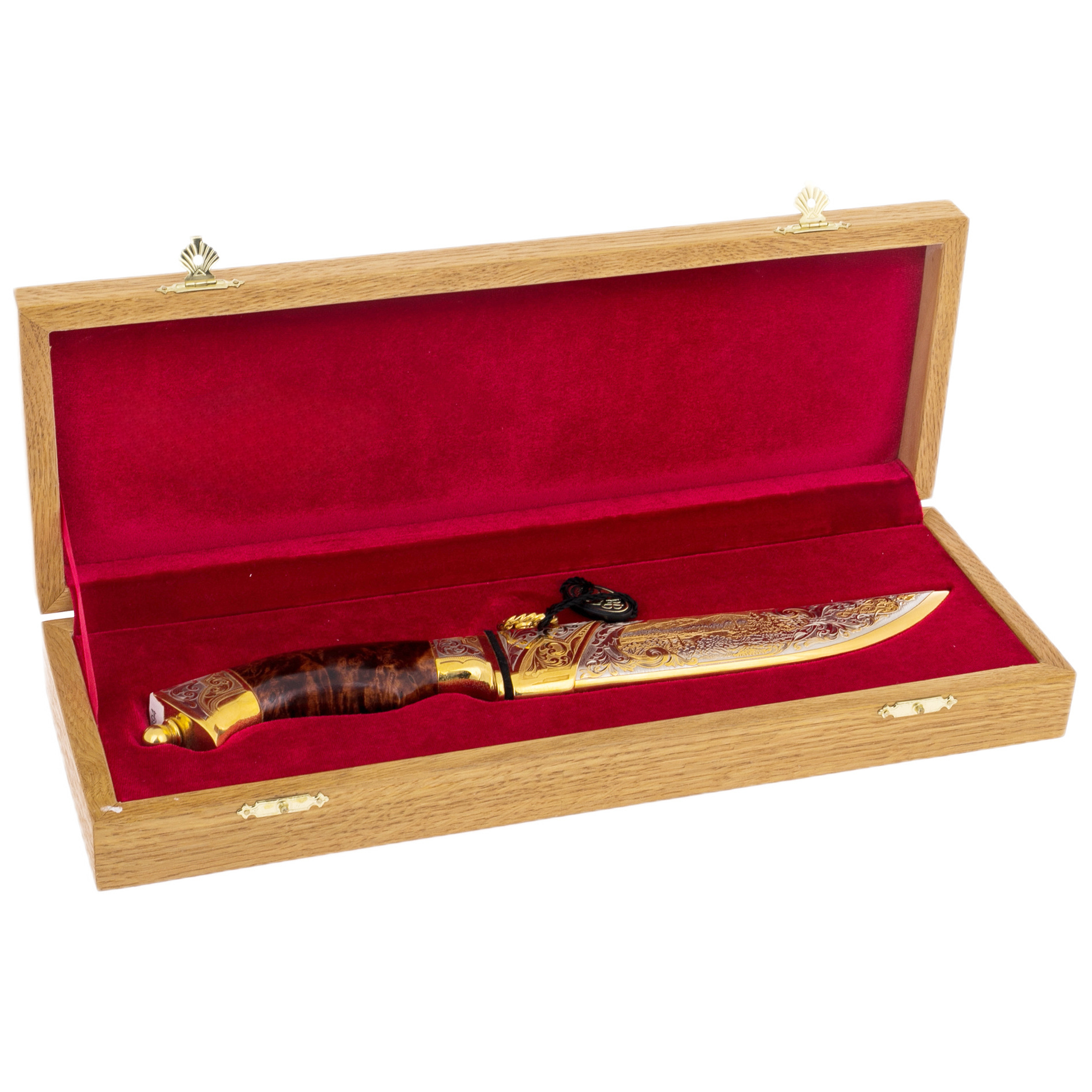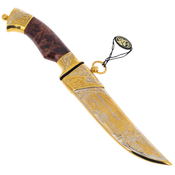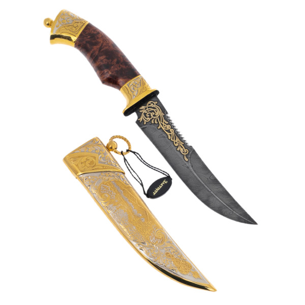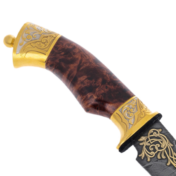 Нож «Сокол» из дамасской стали — предмет, в котором органично сочетаются утилитарная мощь и изысканная декоративность. Его клинок кован из многослойного дамаска с характерным волнообразным рисунком, напоминающим перья хищной птицы. У основания лезвие украшено позолоченным растительным орнаментом, переходящим в массивную гарду. Рукоять выполнена из стабилизированной карельской берёзы, отполированной до глянца и обрамлённой латуневой фурнитурой с золотым покрытием и тончайшей ручной гравировкой.