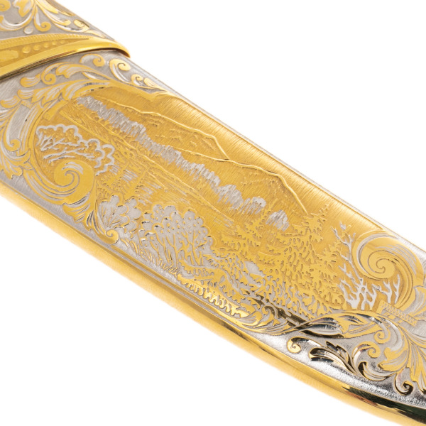 Златоустовская техника художественной обработки металла использована в оформлении ножен: на поверхности красуется пейзаж с горным хребтом, вырезанный вручную по золочёной и никелированной латуни. Плавные линии, тени и детали прорисованы с ювелирной точностью — пейзаж словно оживает на металле. Украшения выполнены в смешанной технике с применением чернения и гравировки, подчеркивающих сложную структуру композиции и объёмность изображения. Все декоративные элементы создаются вручную, что делает каждый экземпляр уникальным.