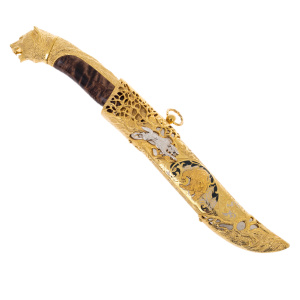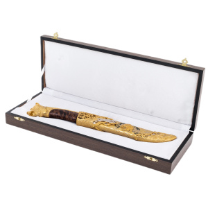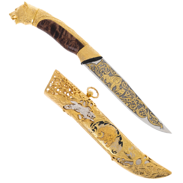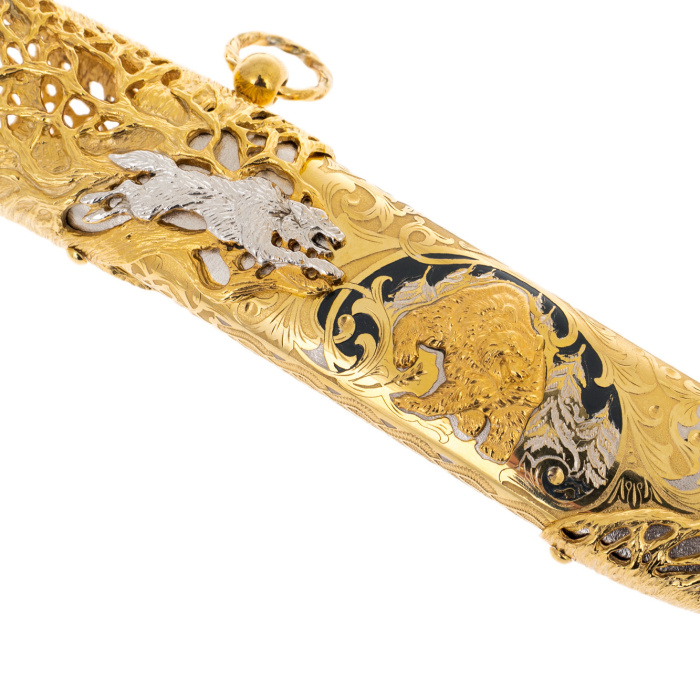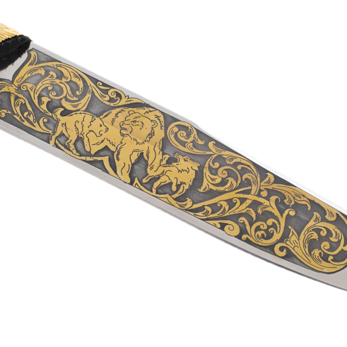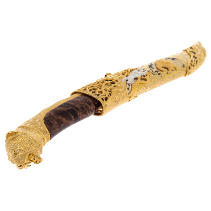 Нож «Медведь» создан как парадный символ силы, выносливости и благородства, присущих северным хищникам, чьё изображение вписано в композицию клинка и ножен. В основе предмета лежит сталь с зеркальной полировкой, украшенная глубоким травлением и покрытая многослойным золочением, образующим сложный орнамент с фигурной сценой. Гарда и тыльник оформлены художественным литьём, формирующим выразительную голову медведя, а рукоять, собранная из ценной древесины с роскошной текстурой, органично переходит в золотые элементы, создавая цельный образ коллекционного оружия.