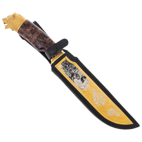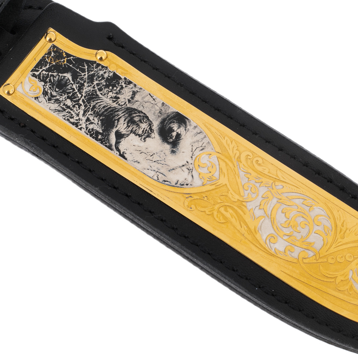 Ножны — продолжение этой истории. Они сшиты из добротной кожи, украшены золоченой пластиной, на которой выгравирована сцена встречи тигра и медведя. Столкновение титанов, в котором нет места слабости, борьба за господство, где побеждает не тот, кто первый нанес удар, а тот, кто уверен в своем превосходстве. Это вечный закон леса, мира, жизни.