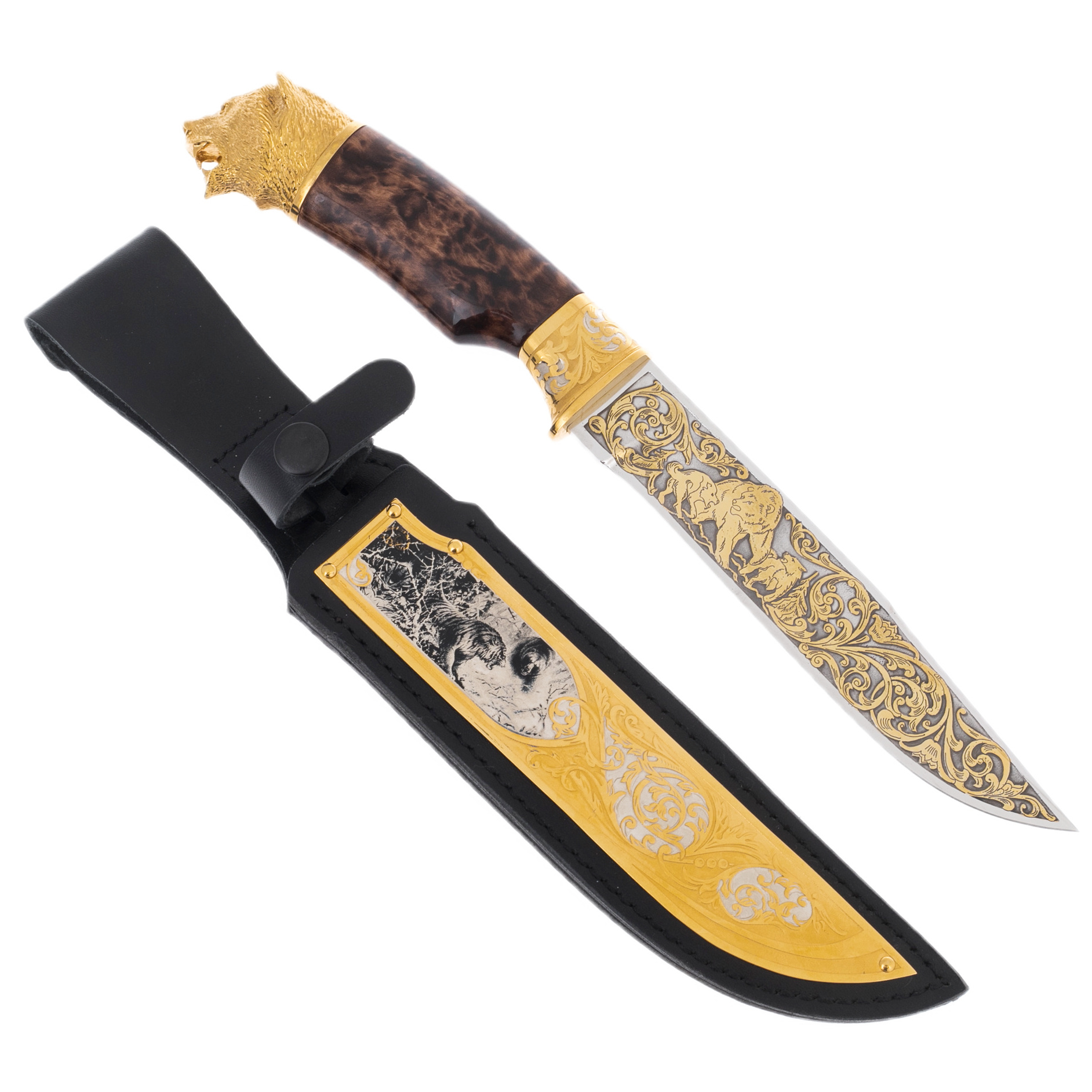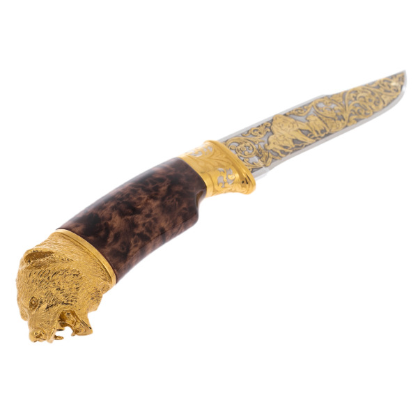 Медведь — властелин леса, воплощение силы, уверенности и непоколебимости. Этот нож несет в себе его дух: холодный блеск стали, золоченый орнамент, массивная голова хищника на рукояти — все говорит о том, что этот клинок принадлежит тому, кто привык доминировать, не вступая в объяснения.