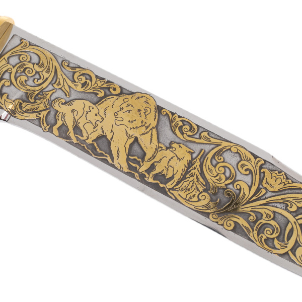 Лезвие сверкает полированной гладью, его поверхность украшена сложным златоустовским орнаментом, среди узоров которого запечатлена сцена из мира дикой природы. Медведь идет вперед, не отвлекаясь на мелочи, не уступая дорогу, осознавая свою мощь. Позолота придает этому изображению особую рельефность, делая его не просто украшением, а символом, подчеркивающим власть владельца.