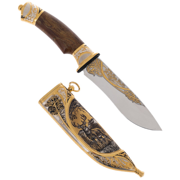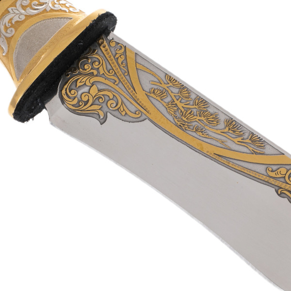 Клинок из высококачественной стали переливается сложным орнаментом, где позолота гармонично сочетается с чёткими линиями гравировки. Тонкие узоры создают эффект, будто сталь дышит, отражая свет и вызывая ассоциации с движением лесного ветра или потоками воды. Рисунки на клинке — это аллегория победы над силами природы, напоминающая о древних охотничьих традициях и связях человека с окружающим миром.