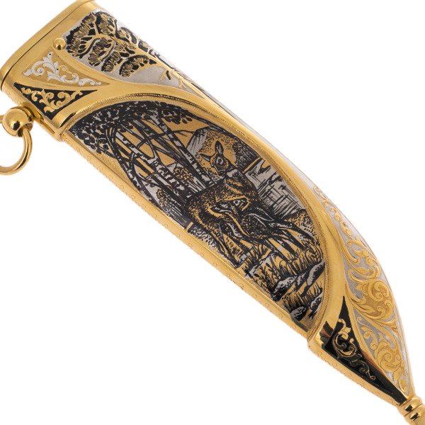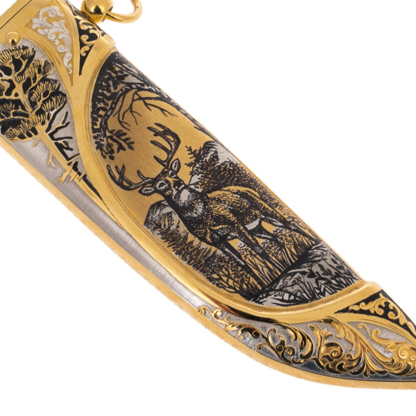 Ножны, украшающие этот уникальный объект, являются самостоятельным произведением искусства. Инкрустированные орнаменты и изящные гравировки с позолотой усиливают впечатление роскоши и приверженности высокому искусству. Изображения, отражающие сцены охоты, служат не только декоративным элементом, но и метафорой силы, ловкости и превосходства, которые так ценятся в охотничьей культуре.