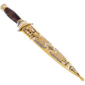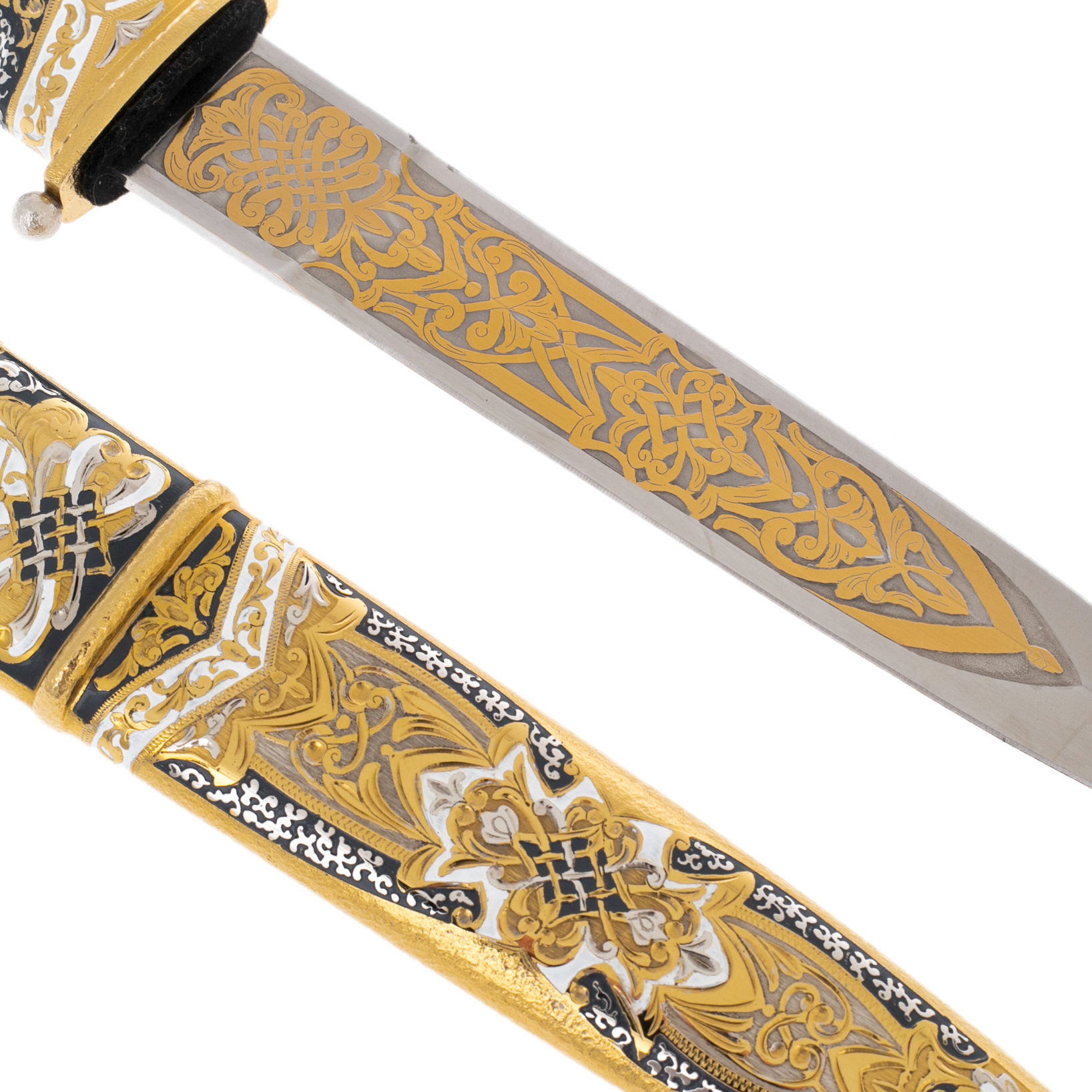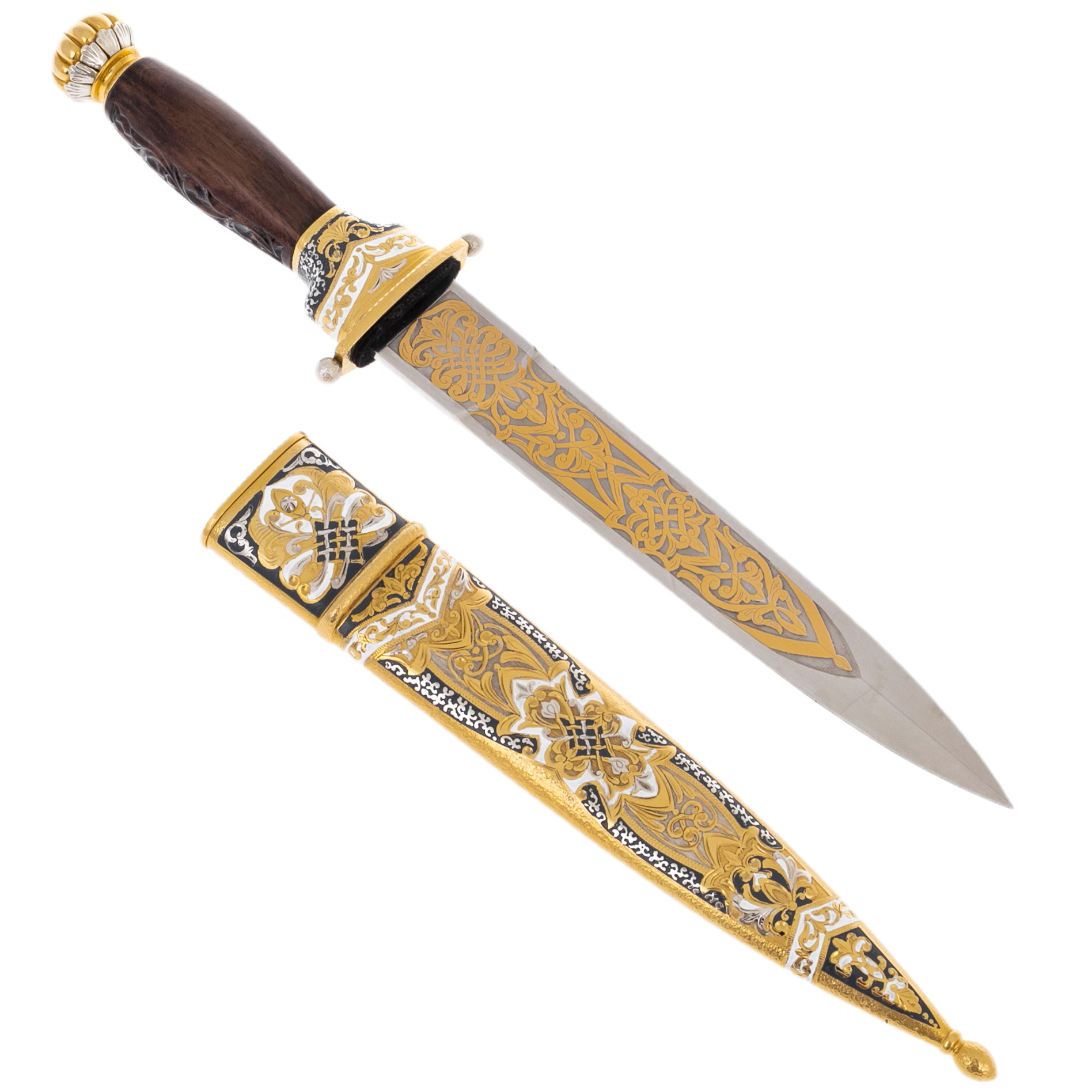 Эта коллекционная композиция являет собой редкий образец златоустовского декоративного оружия, созданного как символ силы, решимости и благородства. Суверенная линия клинка сочетается с парадным убранством ножен, инкрустированных позолотой, чернью и тончайшими орнаментами, выверенными до последнего штриха. Рукоять, выточенная из тёмного дерева с мягким сатиновым блеском, оформлена литой гардой и навершием, создающими впечатление реликвии, передаваемой из поколения в поколение. Клинок с геометрическим узором, выгравированным вручную, воспринимается как безмолвное напоминание о власти, основанной на достоинстве и силе духа.