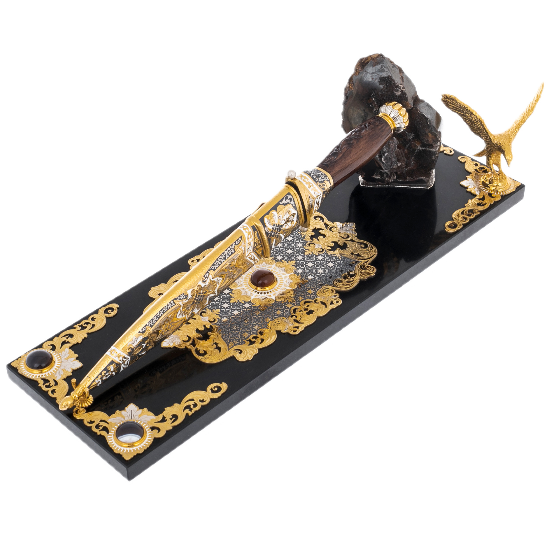 Подставка превращает изделие в полноценный арт-объект: глубокий чёрный камень даёт ощущение монументальности, а золотой орёл, раскинувший крылья над природным самородком, усиливает образ восхождения и свободы. Литьё, выполненное с ювелирной точностью, подчёркивает характер композиции, в которой каждое решение продумано не только эстетически, но и символически. Инкрустации камнями, сияющими мягким внутренним светом, обогащают визуальное восприятие, задавая тон всей работе — уверенный, цельный, властный.