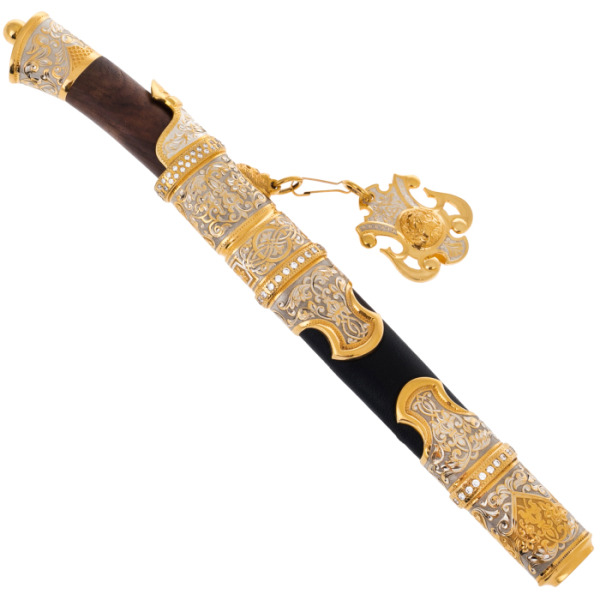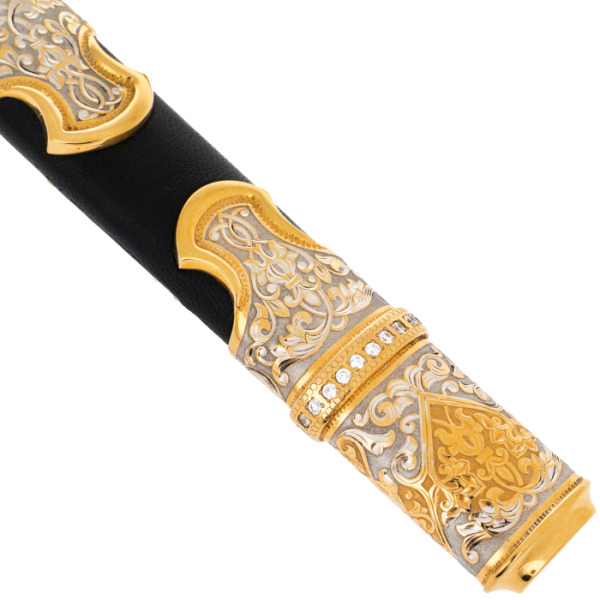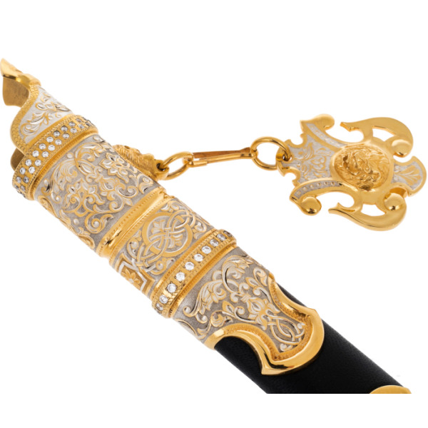 Ножны, украшенные эмалевым изображением тигра, передают весь драматизм и мощь дикой природы. Грозный зверь, вглядывающийся в вас, готов к прыжку, словно предупреждая о скрытой силе этого предмета. Картина на ножнах оживляет образ, превращая его в произведение искусства, достойное занять почетное место в коллекции самых взыскательных ценителей.