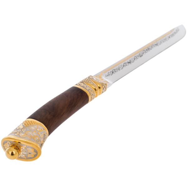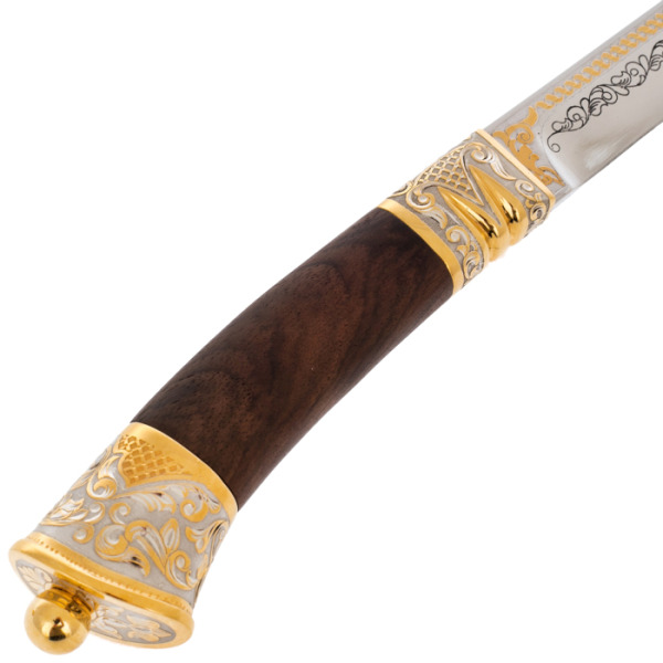 Рукоять изготовлена из ценных пород древесины, отполированных до шелковистого блеска, что придает ножу особую тактильную привлекательность. Венчает конструкцию массивное навершие в виде головы волка, выполненное в технике художественного литья и покрытое золочением. Гравировка на гарде продолжается тончайшим узором, перекликаясь с декором клинка, создавая завершенный и гармоничный образ. Мастера Златоуста веками совершенствовали искусство металлообработки, и этот нож — прямое доказательство высочайшего уровня их мастерства.