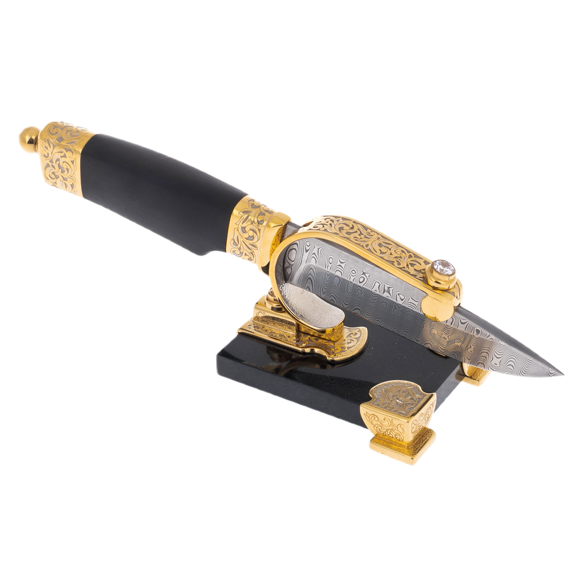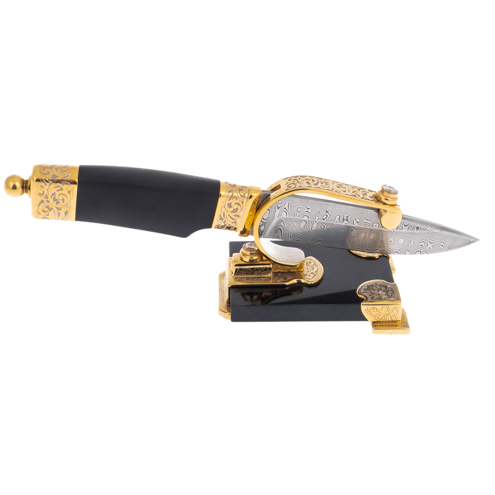 Гармония линий, игра благородных металлов и драгоценных камней превращает этот нож в реликвию, достойную того, чтобы занять почетное место в кабинете, коллекции или в руках человека, способного вершить судьбы. Это не просто предмет – это знак принадлежности к высшему кругу власти, где решения не обсуждаются, а исполняются.
