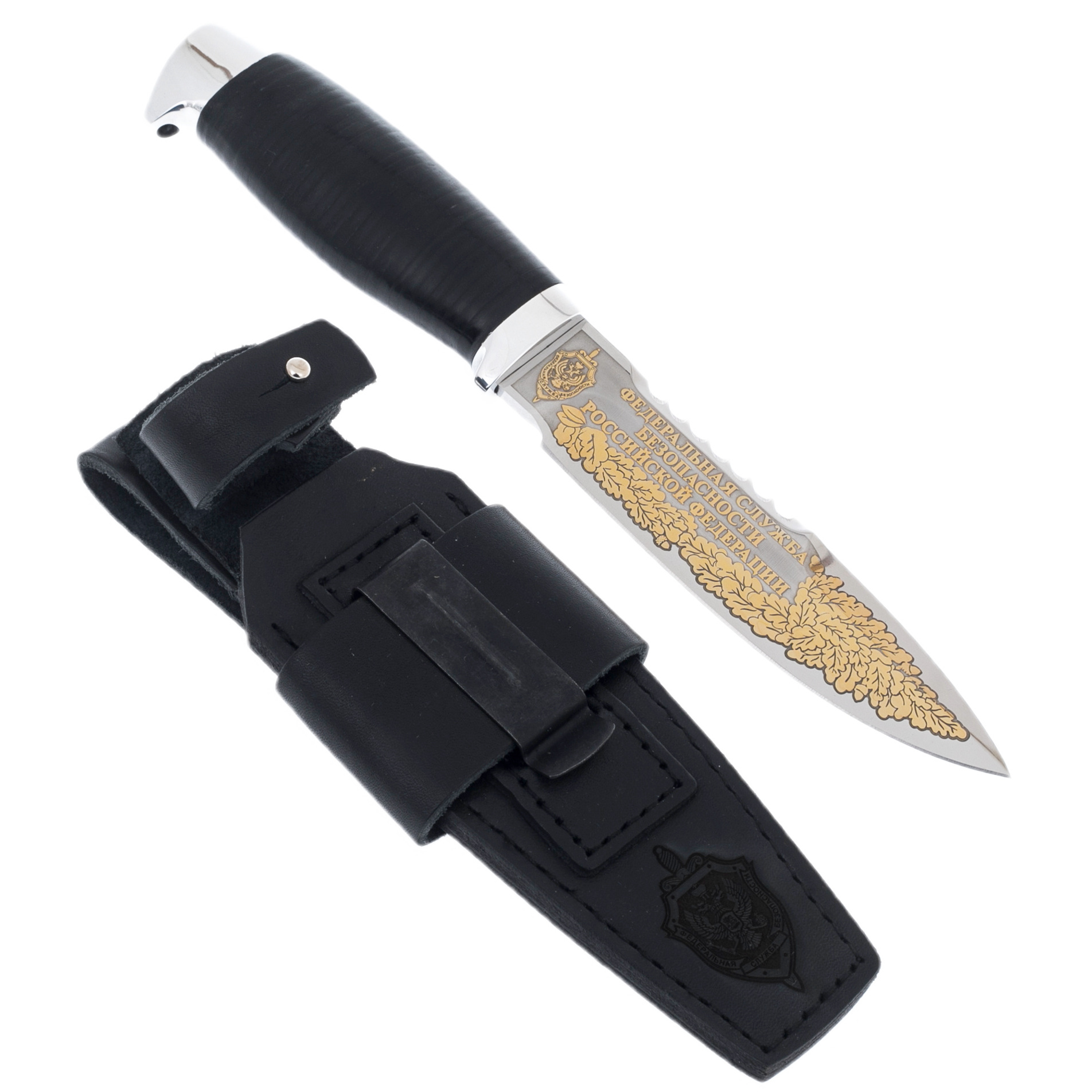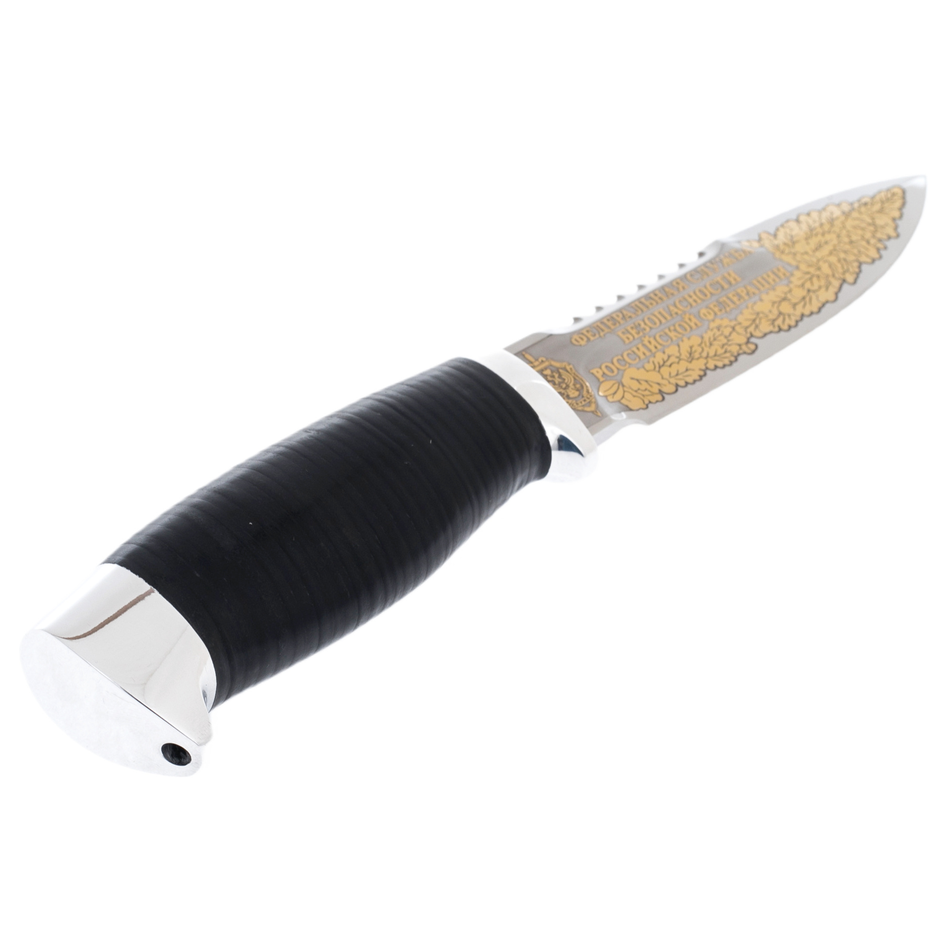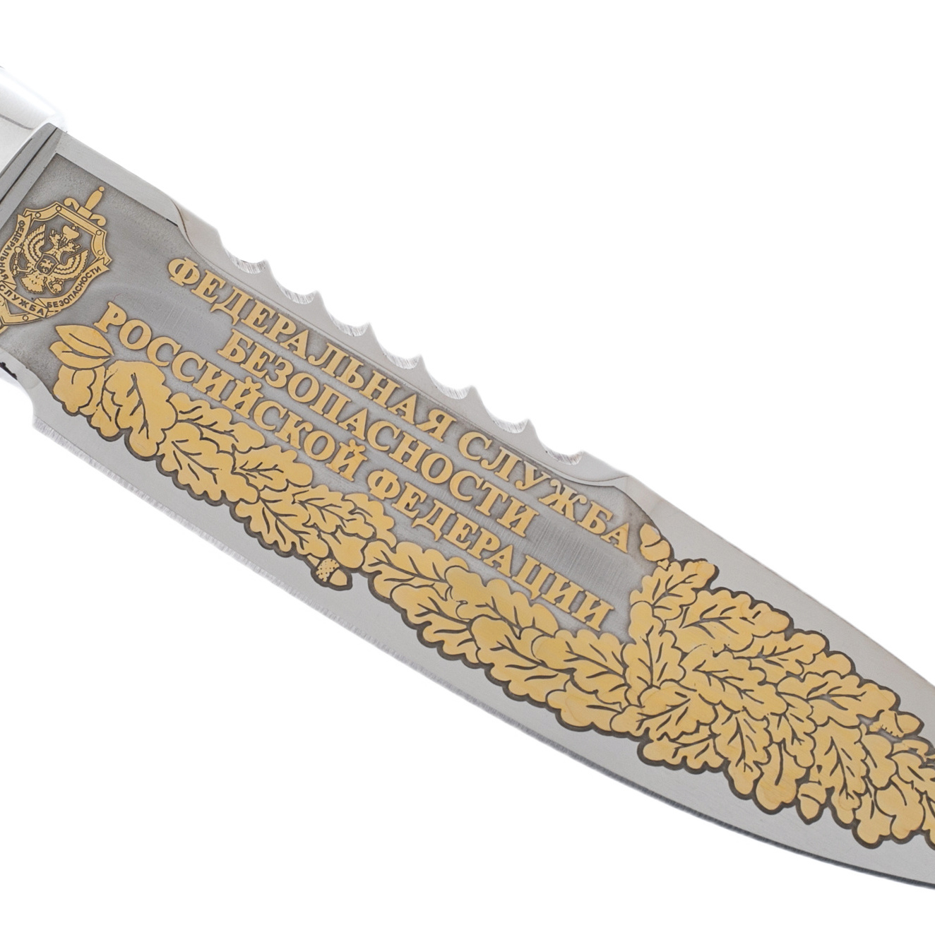 Этот нож создан не просто для владения, а для того, чтобы стать продолжением руки, символом привилегированного положения и достоинства. Гравировка "Федеральная служба безопасности Российской Федерации" на лезвии — не просто надпись, а знак причастности к элите, к тем, кто стоит на страже безопасности и силы. Чехол из благородной кожи — это не просто защита, а обрамление, как рама для шедевра, хранящая и дополняющая его образ, позволяя носить с собой символ величия и власти.