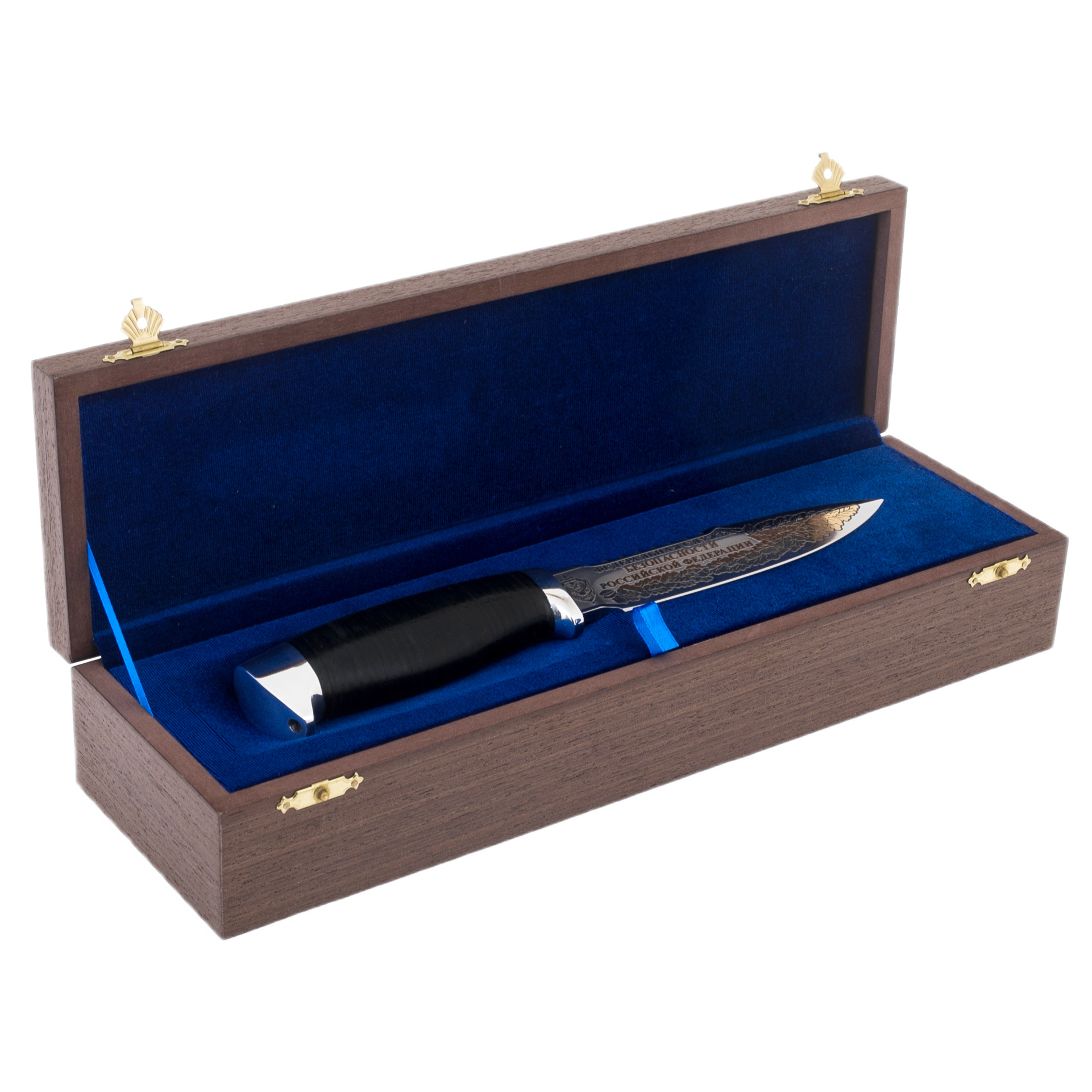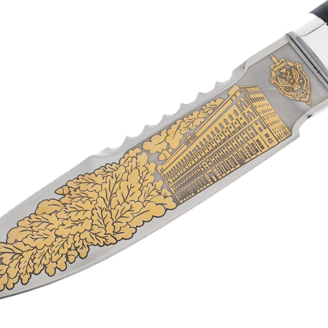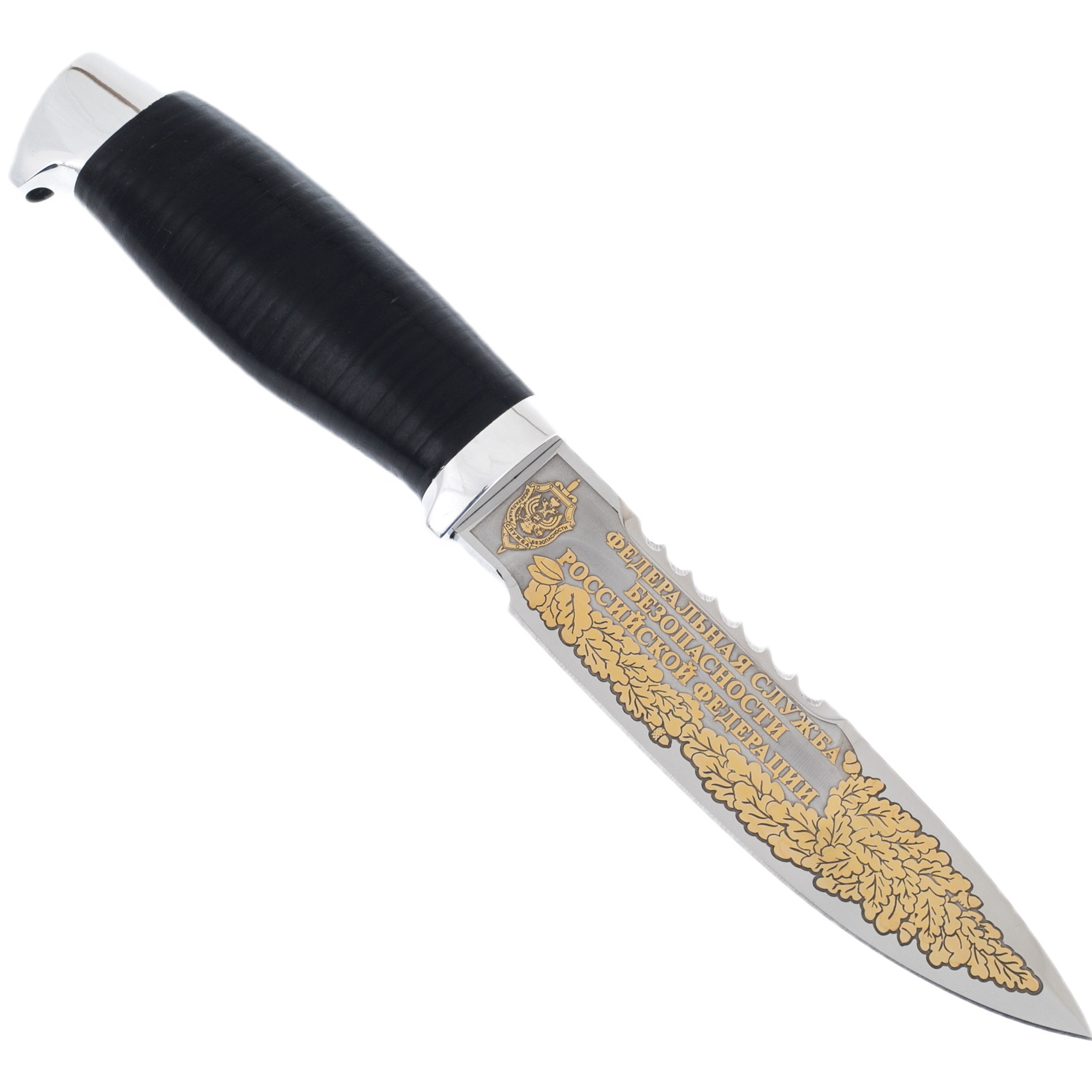 Этот нож создан не просто для владения, а для того, чтобы стать продолжением руки, символом привилегированного положения и достоинства. Гравировка "Федеральная служба безопасности Российской Федерации" на лезвии — не просто надпись, а знак причастности к элите, к тем, кто стоит на страже безопасности и силы. Чехол из благородной кожи — это не просто защита, а обрамление, как рама для шедевра, хранящая и дополняющая его образ, позволяя носить с собой символ величия и власти.