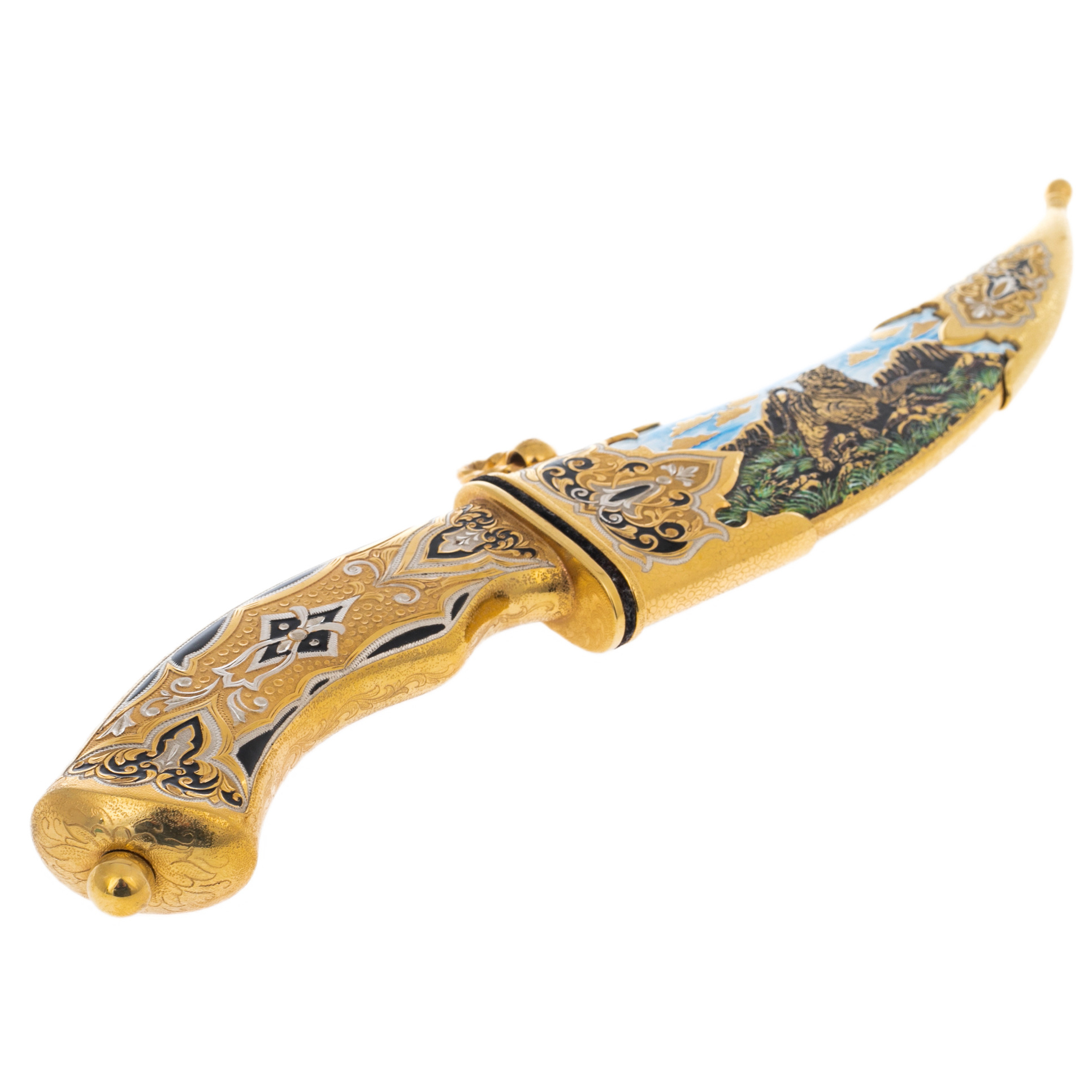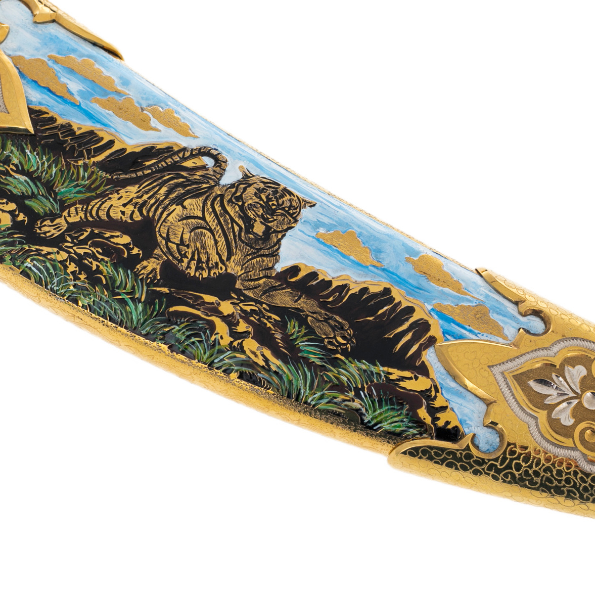 Ножны, украшенные яркими эмалями и позолотой, представляют собой живописный фон, на котором разыгрывается сцена дикого величия. Поза тигра излучает спокойствие и силу, а глаза проникают в самую суть мироздания. Тигр, как символ хищника и стража, не оставляет сомнений в том, что перед вами предмет не только роскошный, но и наделённый особой энергетикой.