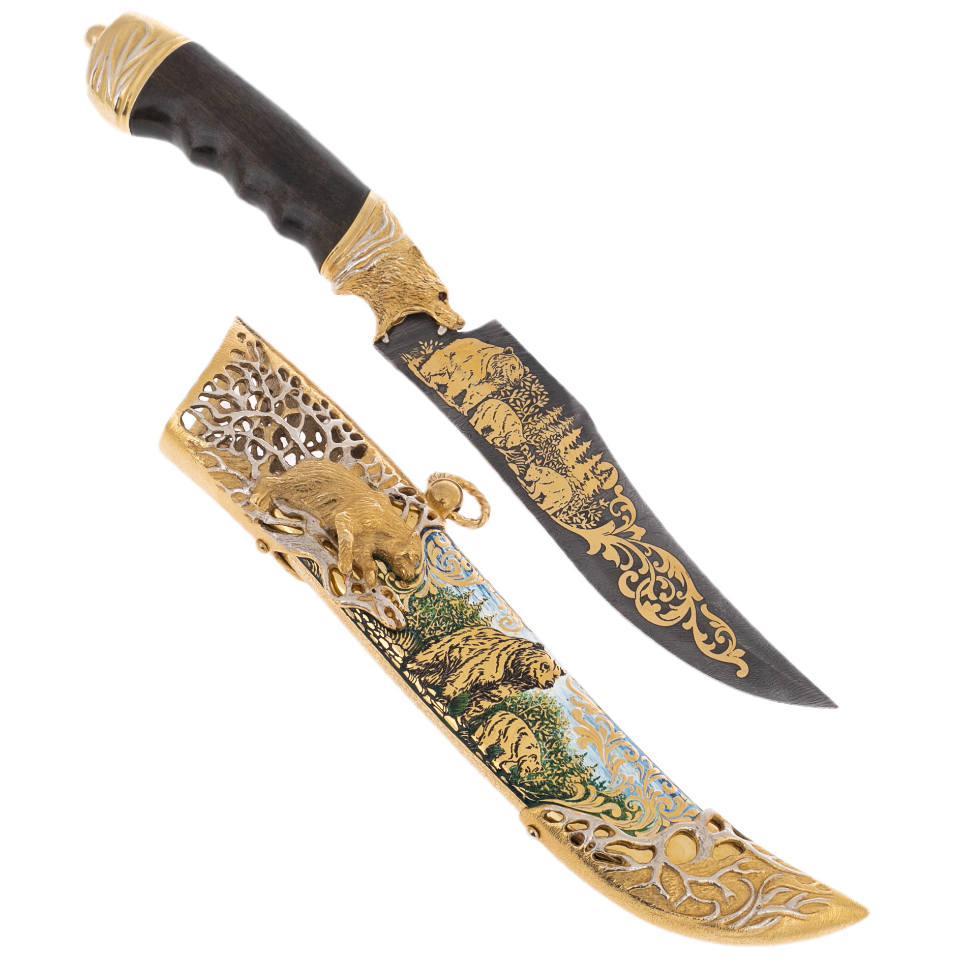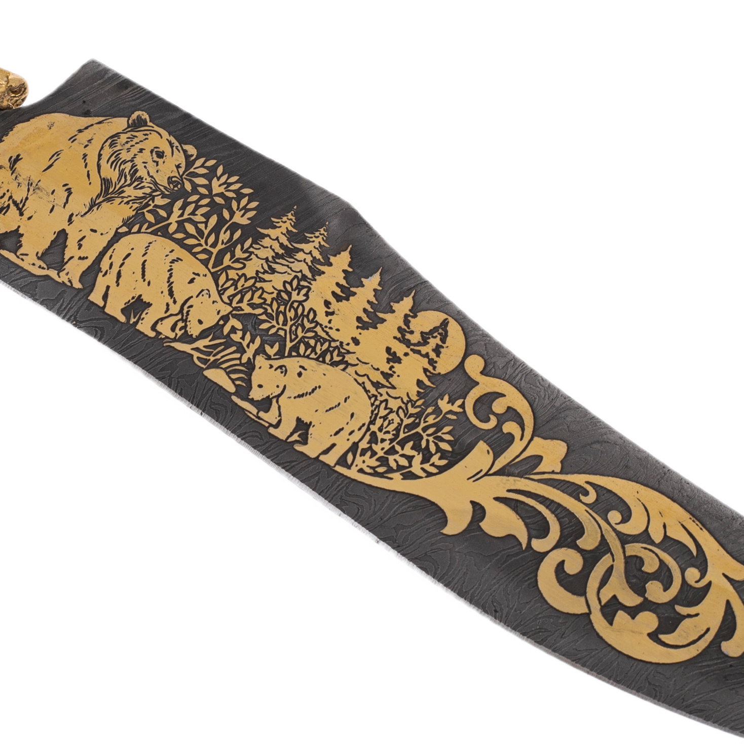Клинок из дамасской стали являет собой симфонию линий, каждая из которых говорит о многослойности и прочности материала. Тонкая гравировка с позолотой изображает медведей – символов мощи, храбрости и родной земли. Звери, выполненные с доскональной детализацией, будто оживают, передавая величественный дух леса. Чёрный фон клинка создаёт контраст, подчёркивая золотое сияние орнамента и напоминая о загадочности лесных глубин.