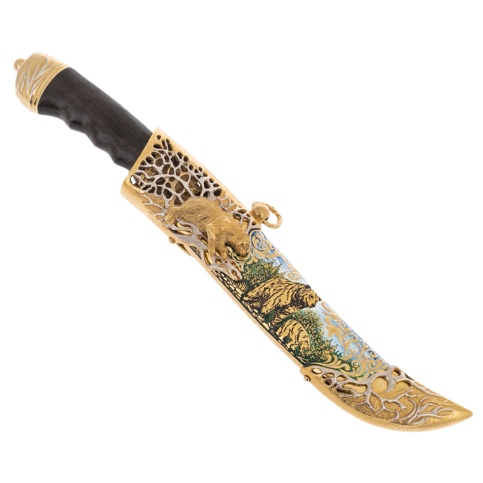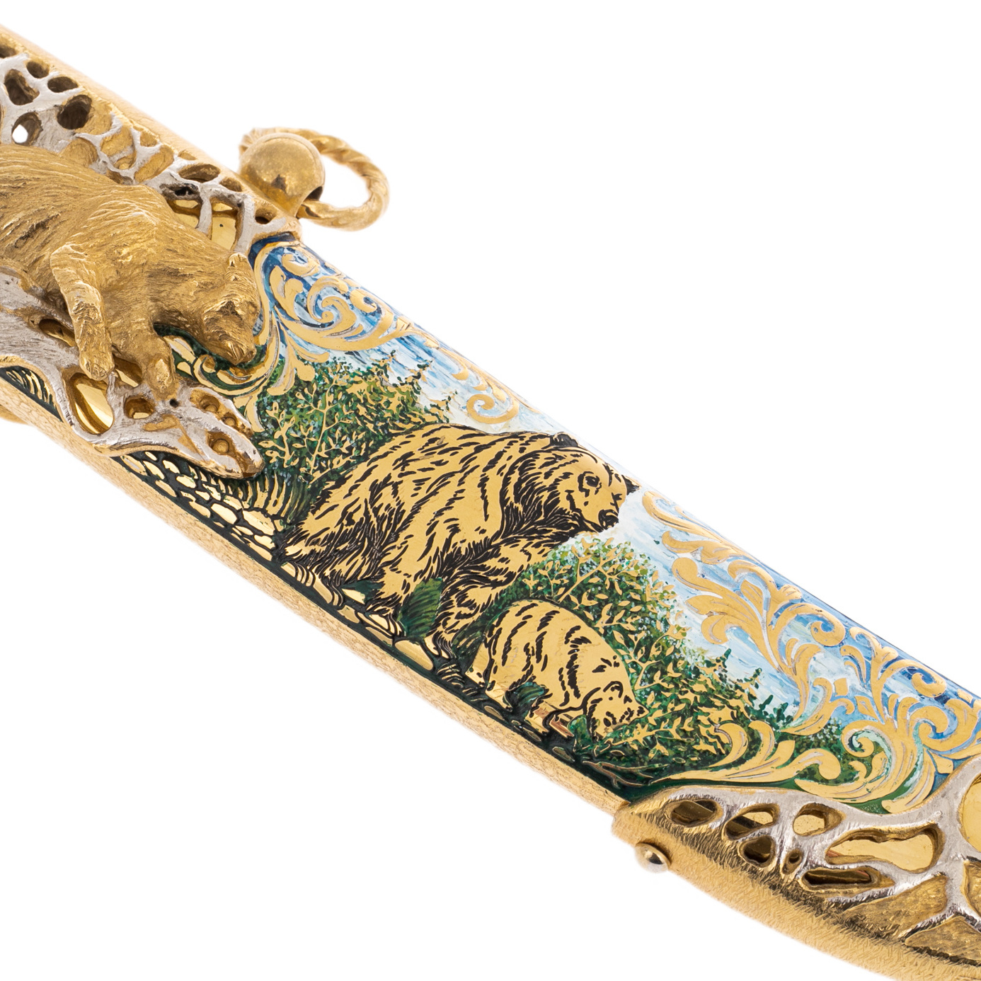 Ножны, изготовленные с использованием тончайшей техники, рассказывают историю таёжной жизни. Рельефный узор, создающий эффект ветвей деревьев, дополняет яркая эмаль, изображающая лесных обитателей. Сцены с медведями, отражающие их спокойствие и мудрость, вызывают уважение и восхищение, пробуждая чувство сопричастности к природе. Сквозные узоры ножен добавляют воздушности и объёмности образу, соединяя функциональность и изящество.