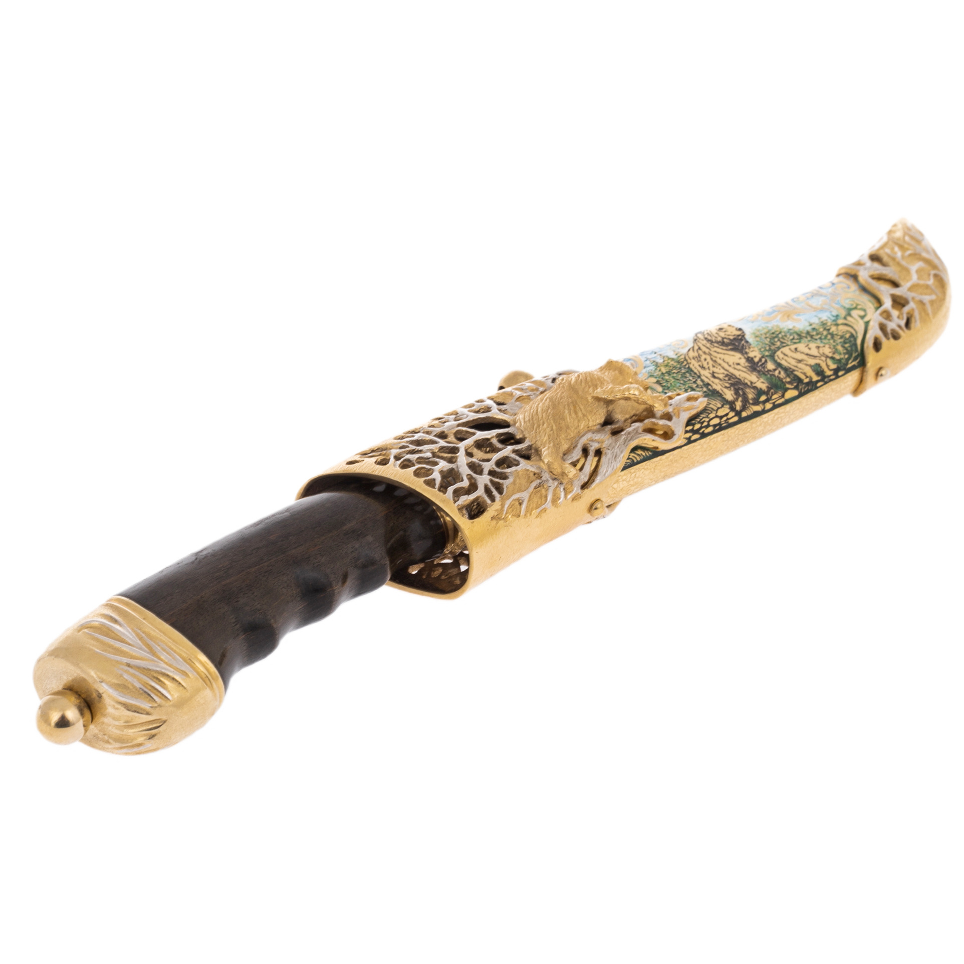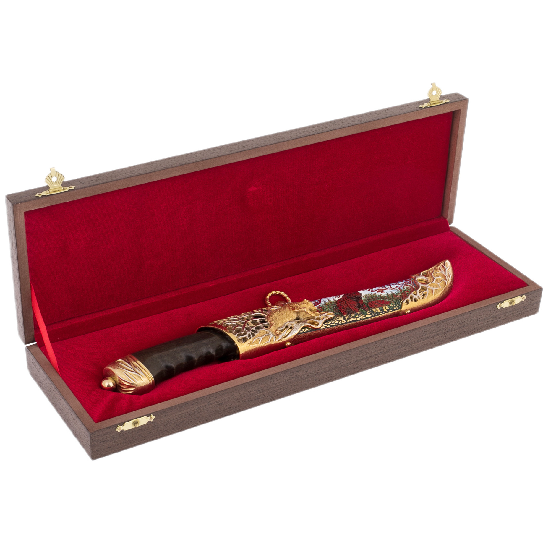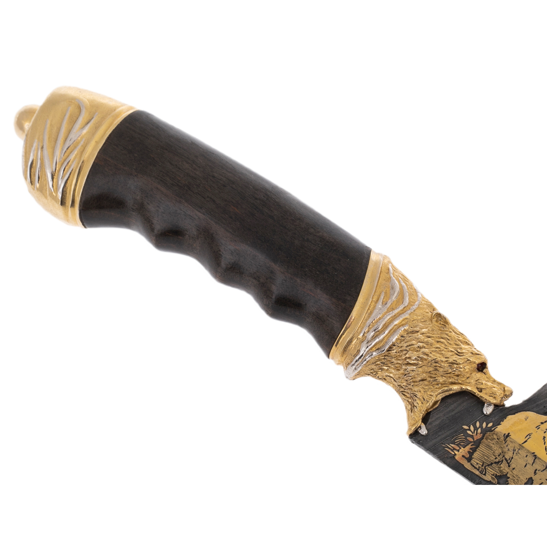Рукоять из редкой древесины тёмного оттенка излучает теплоту и надёжность. Её форма создана для того, чтобы удобно ложиться в руку, обеспечивая уверенный и комфортный хват. Завершают рукоять золотые элементы, выполненные в виде головы медведя, олицетворяющей силу и защиту. Этот элемент говорит о гармонии утилитарного и эстетического.