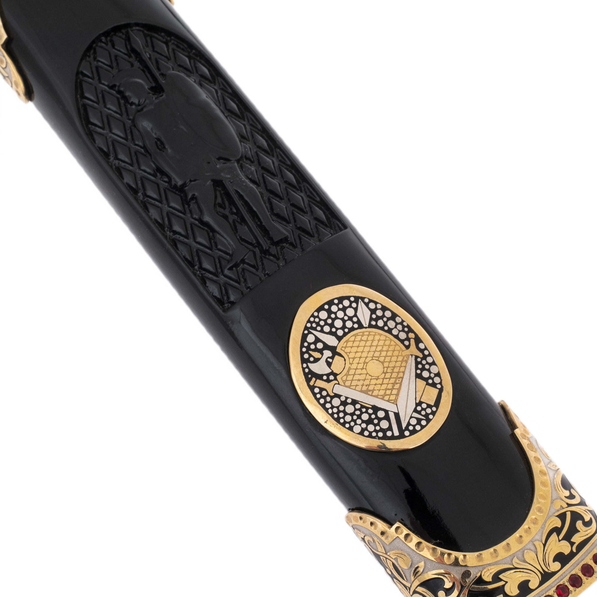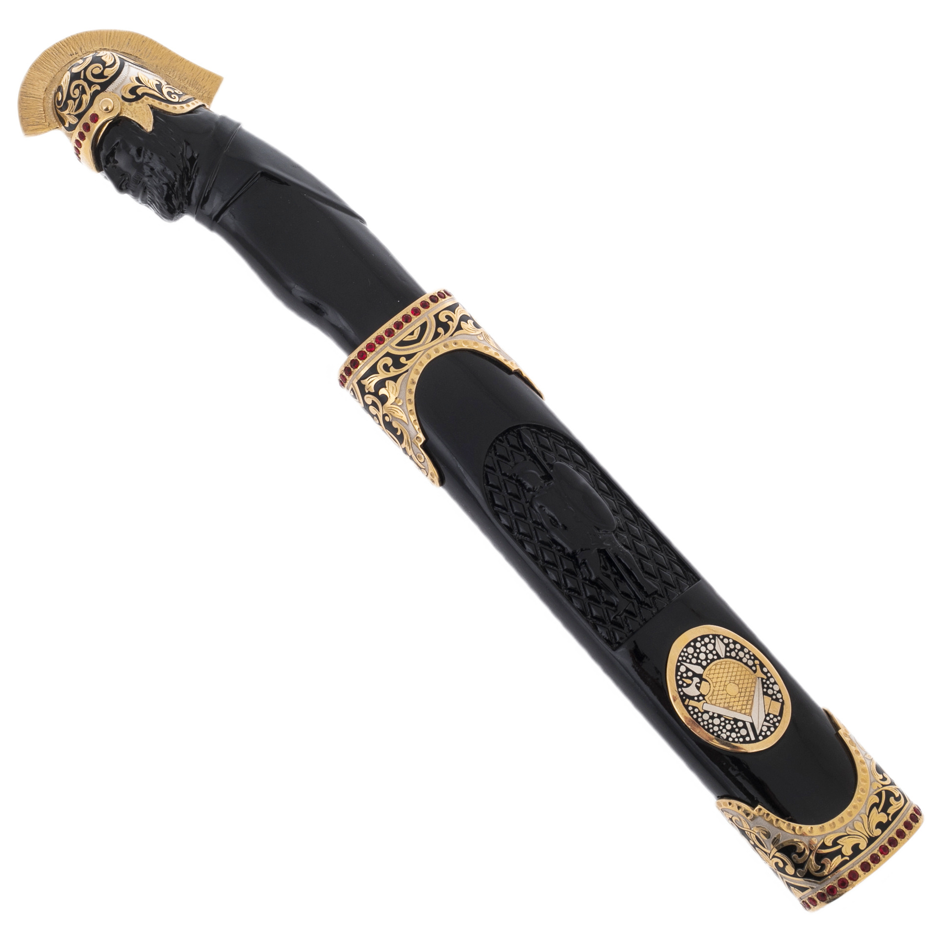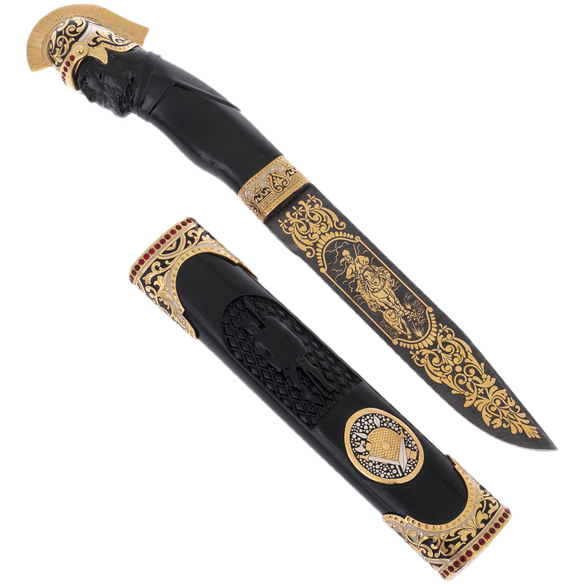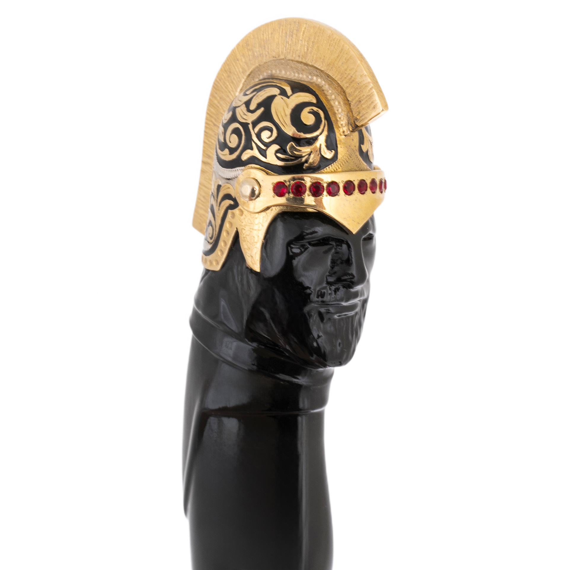 Рукоять, выполненная из благородного чёрного материала, представляет собой миниатюрную скульптуру – голову древнего воина в шлеме. Золочёный шлем с инкрустацией красными фианитами напоминает о древних сражениях, олицетворяя силу и бесстрашие. Эргономичная форма рукояти обеспечивает удобство и уверенность в хвате, делая нож не только произведением искусства, но и практичным предметом.