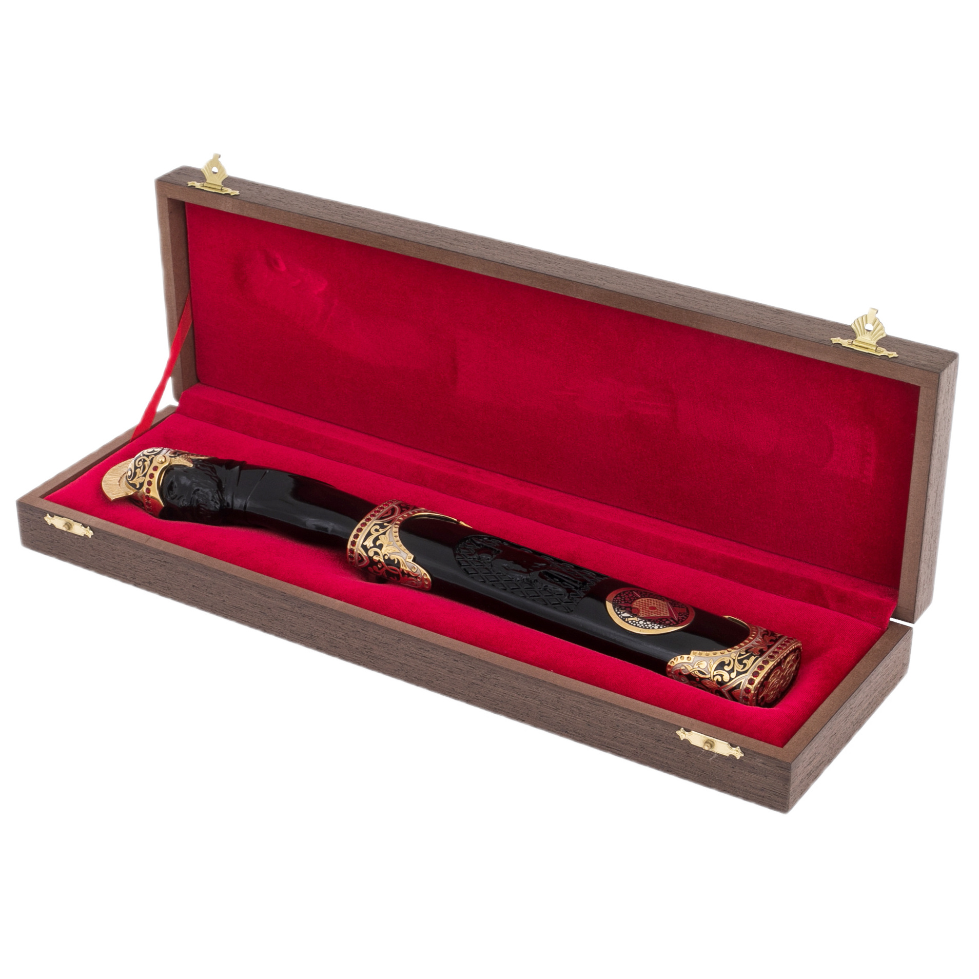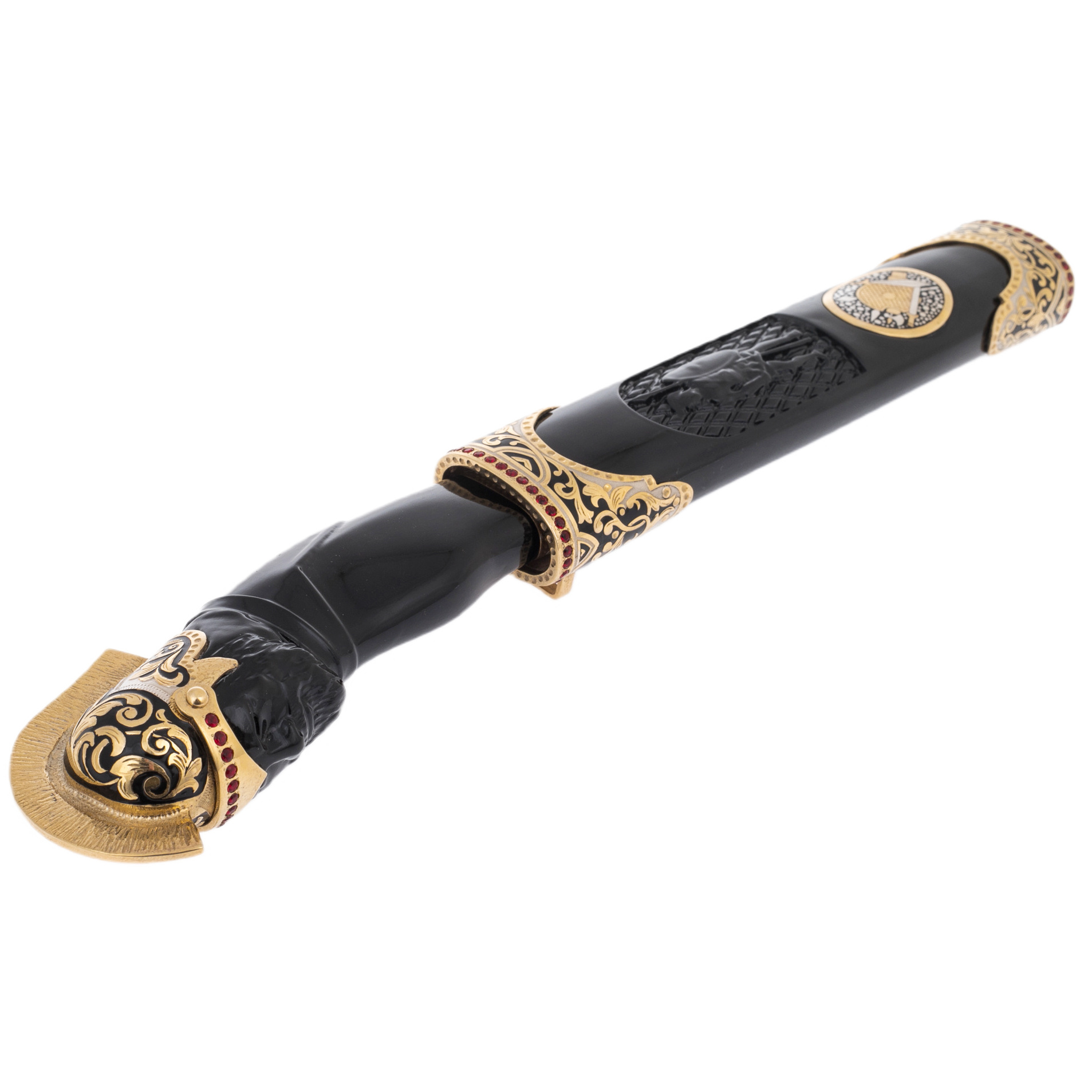 Ножны из того же благородного материала дополняют композицию, превращая её в целостный ансамбль. Рельефный рисунок с изображением воина и символов древности сочетается с изысканными золотыми элементами. Инкрустация красными камнями добавляет благородства и подчеркивает элитарность изделия.