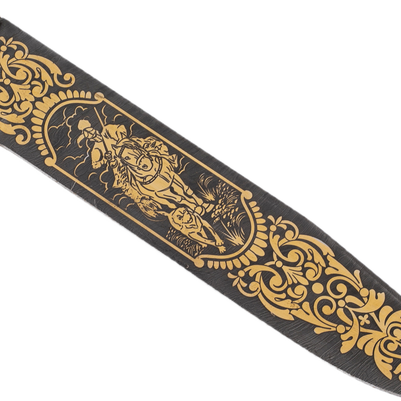Клинок из дамасской стали демонстрирует безукоризненную точность исполнения. Его поверхность украшена изящной позолоченной гравировкой, изображающей воина на коне – сцену, воспевающую триумф и величие. Золотые узоры, словно вихрь, обрамляют эту картину, создавая эффект движения и энергии. Глубокий чёрный фон подчеркивает блеск золота, придавая клинку торжественный вид.