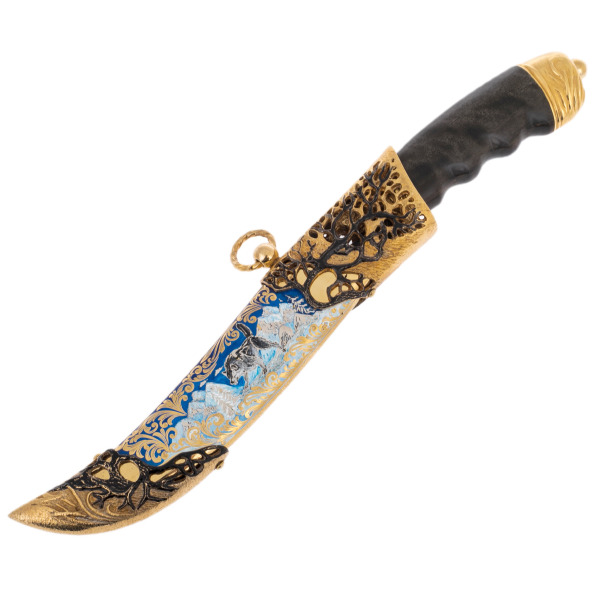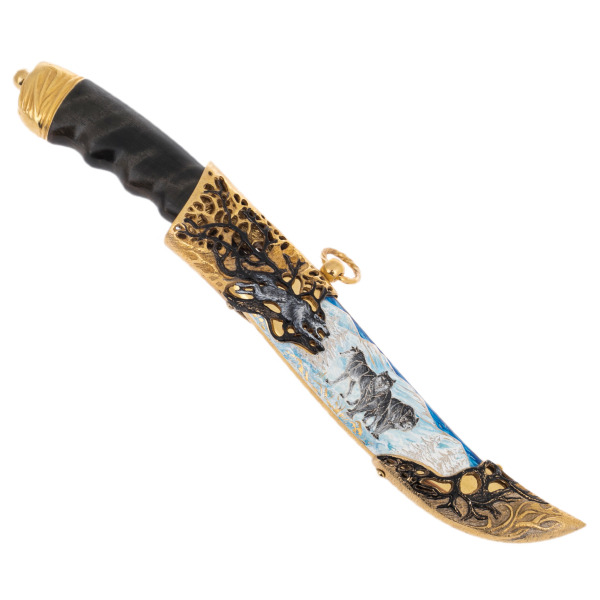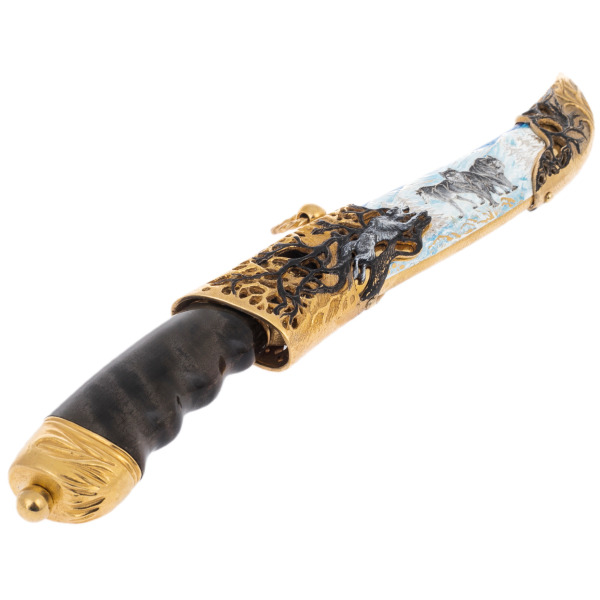 Ножны – отдельная история. Они заключают в себе не только надёжность и практичность, но и целый мир, запечатлённый в металле и эмали. Сцены с волчьей стаей, выполненные в тончайшей технике, переносят в глубину веков, где волк являлся символом лидерства и сплочённости. Сквозная резьба, напоминающая разветвлённые корни и ветви, будто дышит жизнью, соединяя современность и древние традиции.