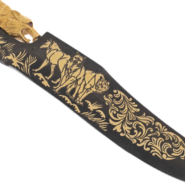 Клинок, выкованный из дамасской стали, раскрывает перед глазами бесконечное многообразие узоров, напоминающих вихри ветра и следы хищника на снегу. Позолоченные мотивы на чёрном фоне переливаются, словно солнечный свет на сумрачной поляне. Гравировка, изображающая волков, словно оживает на поверхности, подчёркивая решимость и грацию этих животных. Каждая линия пронизана величием, которое вдохновляет и завораживает.