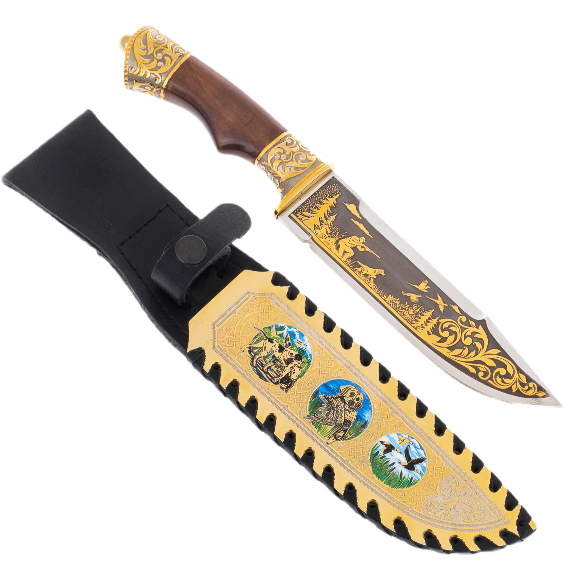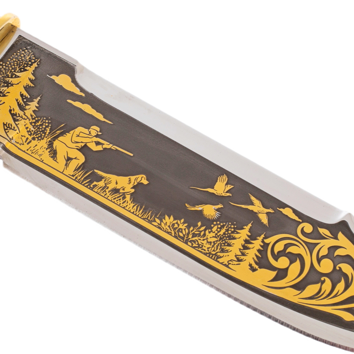Клинок, украшенный гравировкой с золотым покрытием, представляет собой гармонию природы и охотничьей романтики. Изящные узоры на лезвии оживают в сценах охоты, передавая динамику движения, дыхание леса и полёт птиц. Взглянув на него, ощущаешь, как дыхание времени соединяется с искусством современности, а каждый штрих отражает уважение к традициям мастеров.