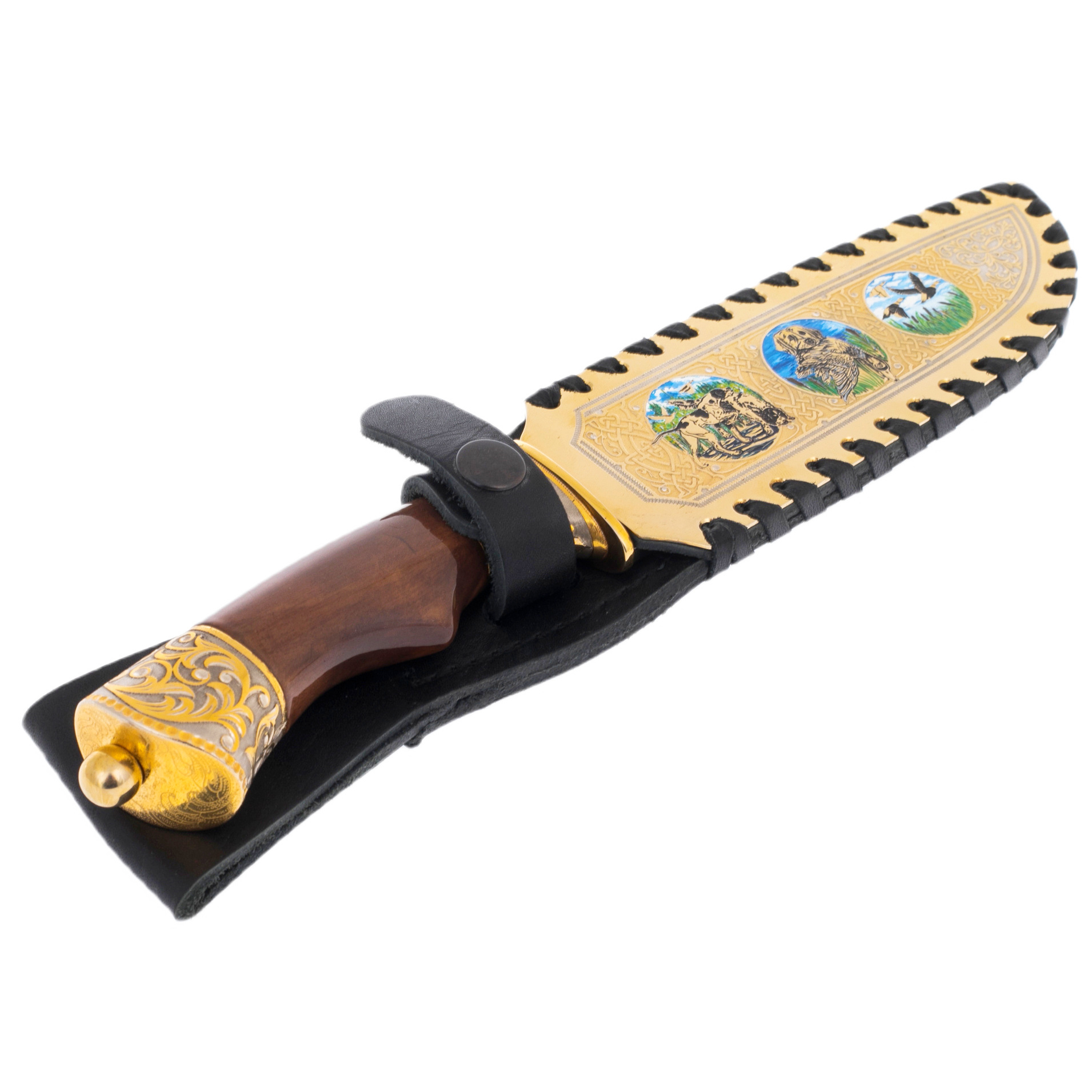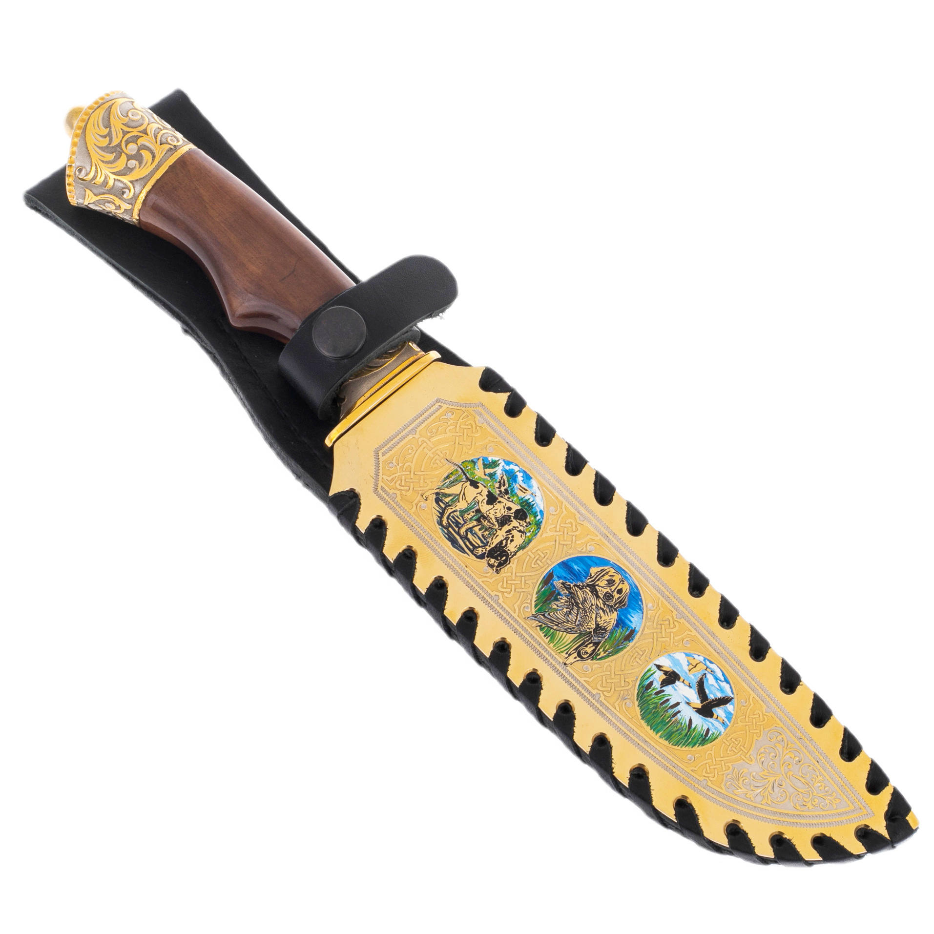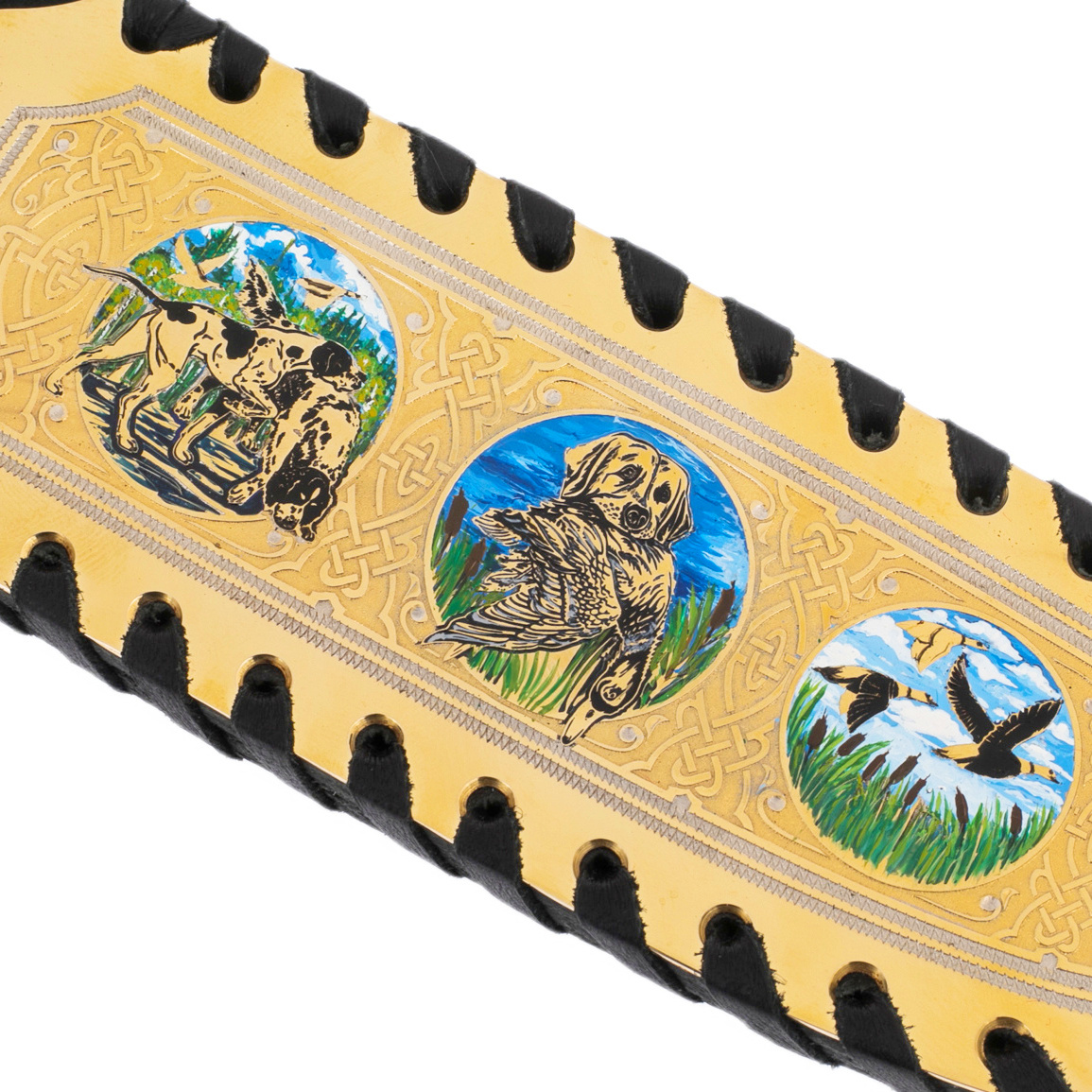 Ножны, выполненные из кожи, дополнены металлической вставкой с художественными миниатюрами. Ручная роспись и яркие образы охотничьих собак, птиц и природы добавляют изделию уникальности, превращая его в произведение искусства. Они не только защищают клинок, но и сами являются объектом восхищения, достойным коллекции истинного знатока.