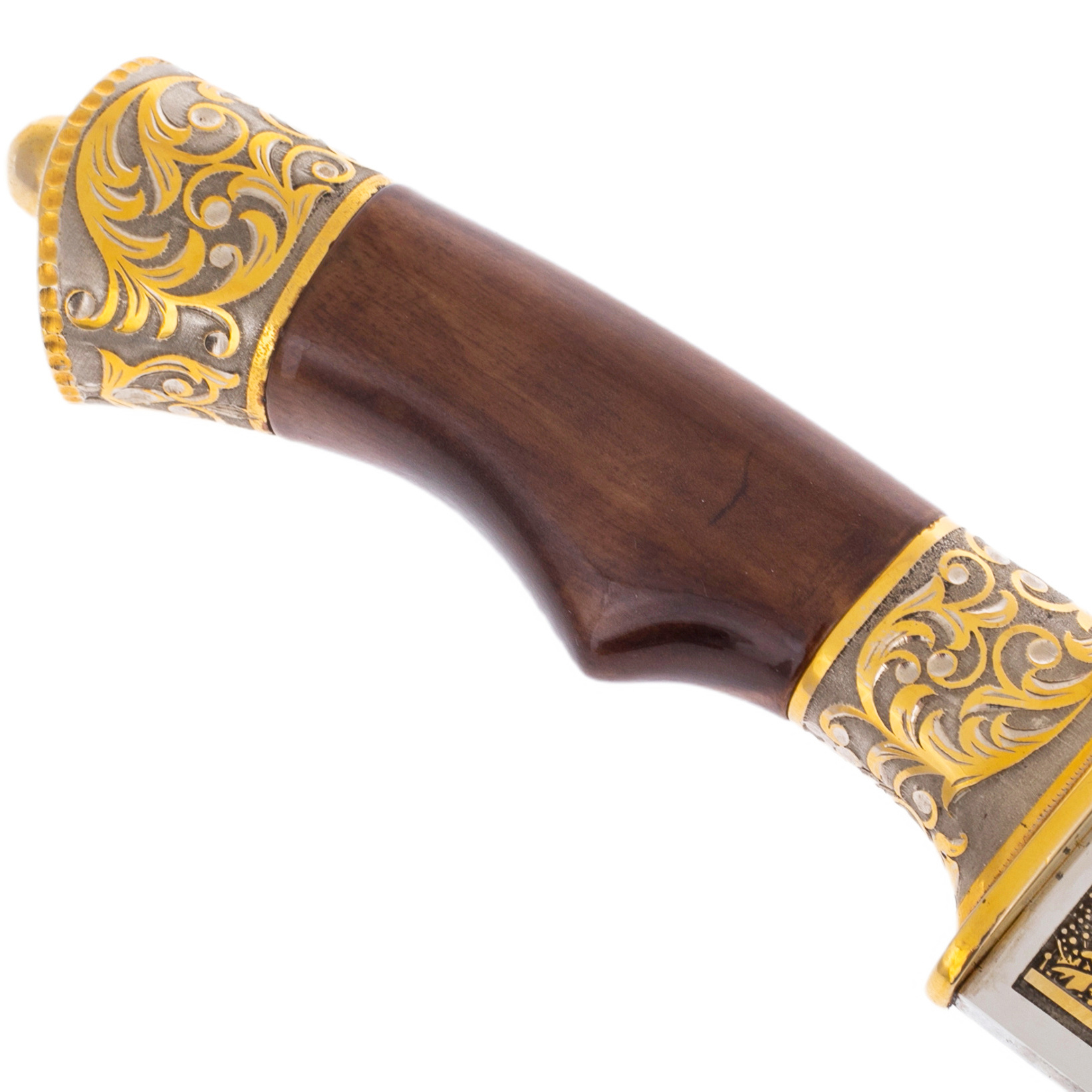 Рукоять из натурального дерева, идеально отполированная, ложится в руку, наполняя её уверенностью и силой. Украшения в виде золотистого орнамента на навершии и гарде придают ножу особую утончённость, напоминая о том, что настоящая мощь всегда соседствует с изяществом.