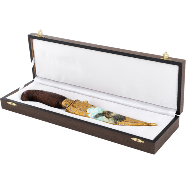 Нож украшенный "Змея" ЗлатоустНож украшенный "Змея" ЗлатоустС давних времен производством оружия занимались лучшие мастера из Златоуста. Художественные клинки, кинжалы, стилеты, кортики, мечи, шашки и топорики выполнялись вручную из стали высокого качества в технике Златоустовской гравюры на металле. Наши оружейники прекрасно разбираются в технике гравировки, травления, серебрения и золочения. Мы предлагаем вам лучшие образцы подарочного оружия, каждое из которых является шедевром оружейного мастерства. Дорогое коллекционное оружие подчеркивает высокий статус его владельца. Вы можете украсить сувенир оригинальным поздравлением или заказать рисунок по своему эскизу.