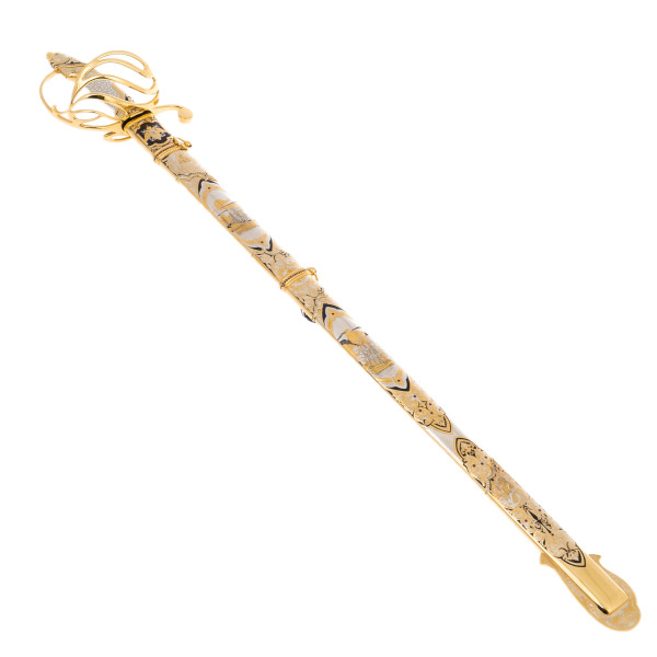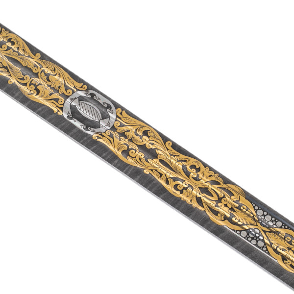 Палаш «Посейдон» из дамасской стали — исключительное произведение оружейного искусства, воплотившее морскую мощь, миф и златоустовское мастерство. Лезвие вытянуто с точностью ритуального клинка, на его поверхности — многослойный орнамент, инкрустированный золотом, серебром и чёрнением. Рукоять украшена сияющей гардой сложной формы в виде раскрытой раковины или морской волны, обрамляющей рукоять из белой скатовой кожи с гравированными деталями. Ножны превращены в богатейшую картину — на них изображены парусники, русалки, якоря, элементы морского сражения, обрамлённые фантастическими завитками, кристаллами, гранатами и сияющими каплями, будто взятыми с гребней морской пены.